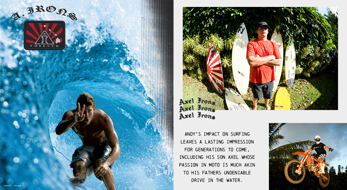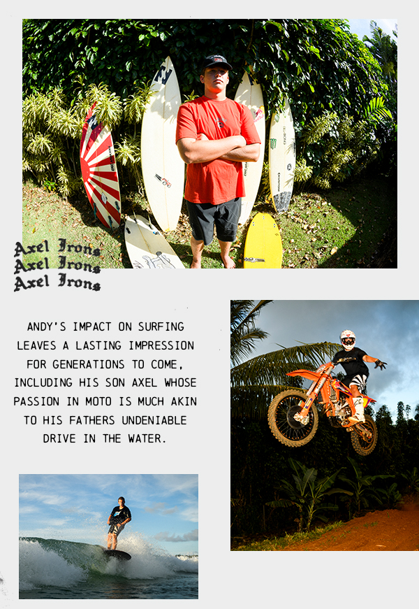 アクセルの姿には、誰もがアンディの面影を重ねる。「話し方や笑い方が、クレイジーなくらいお父さんにそっくりなんだ」とジョエルは語る。サーフィンだけでなく、バイクにも夢中なアクセル。そのアグレッシブなスタイルと天性の才能は、まさしく父譲りだ。