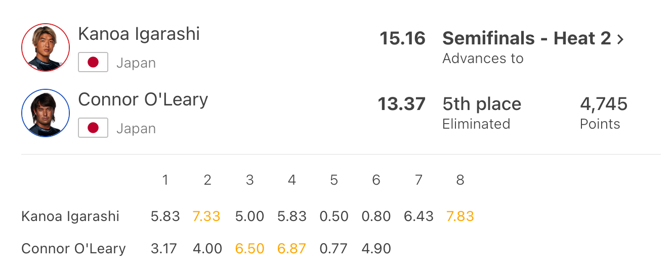 カノアはラストライドでエアリバースをメイクし、トップスコアを塗り替えて勝利。カノアがセミファイナルへ勝ち上がり、コナーは5位でフィニッシュとなった。