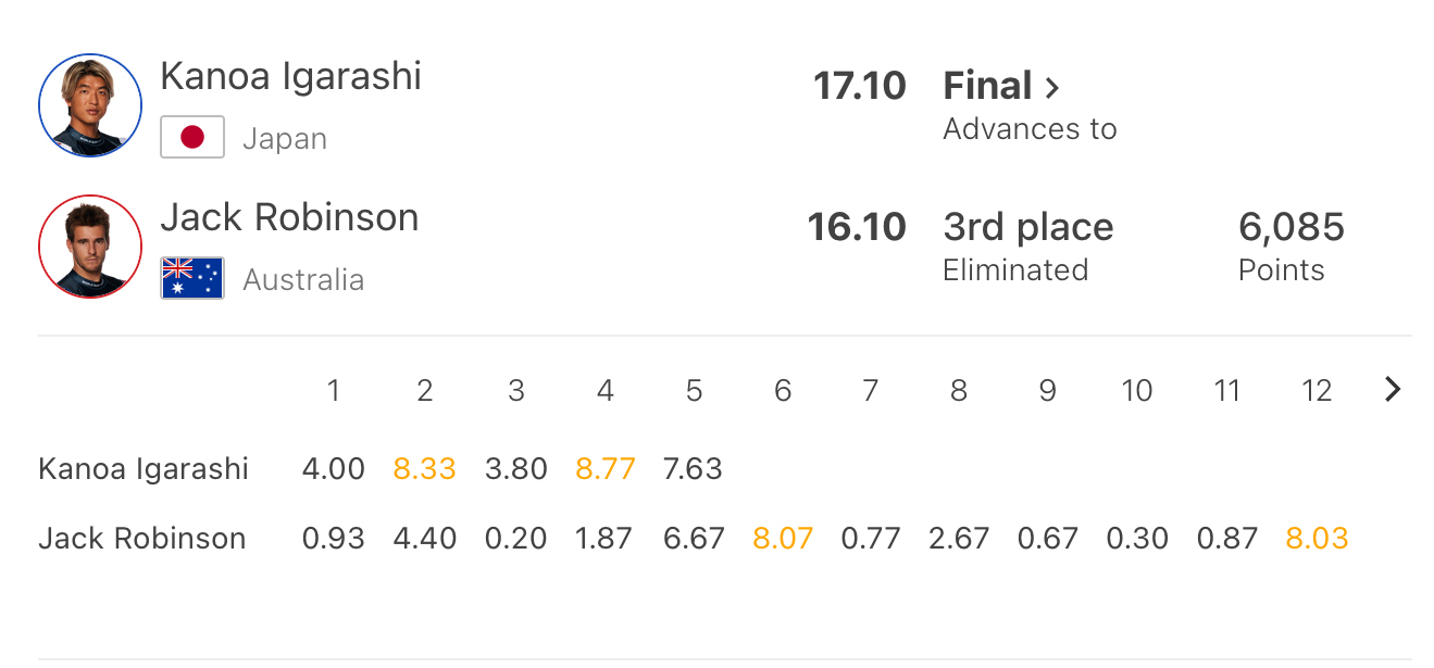 カノアはビーチに集まった応援団からの声援を力に変えて、2本目のエクセレントをスコアして、ジャックをコンビネーションに追い込む。終盤巻き返した流石のジャックもカノアに惨敗。見事ファイナル進出を決めた。