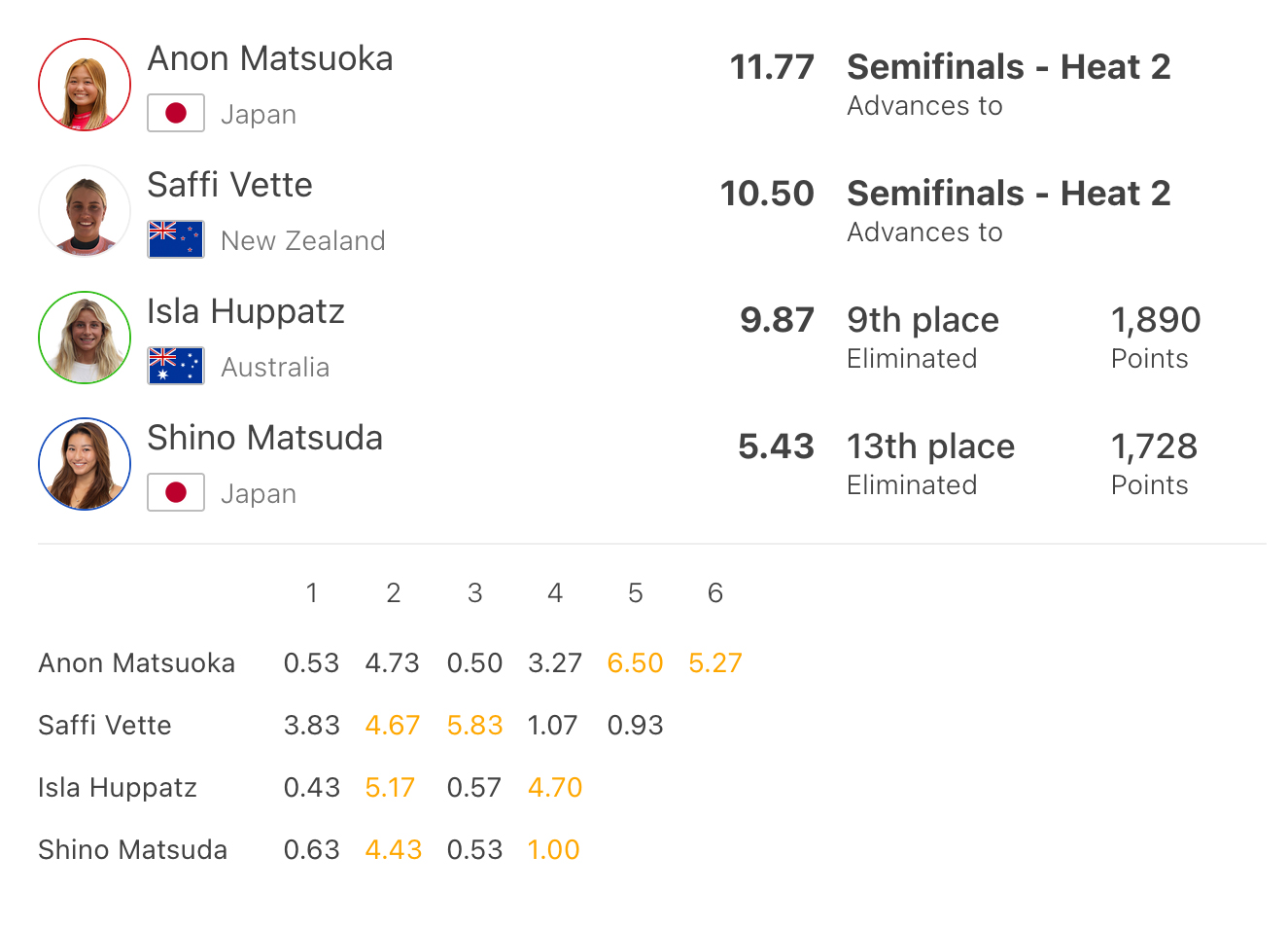 松岡はじっくりと波を選び、ファーストライドで2ターンコンボを決め7ポイントをマーク。セカンドウェイブではビッグセットを掴んでバックアップを5.60としてトップに躍り出る。
