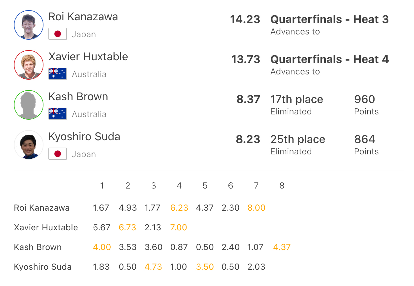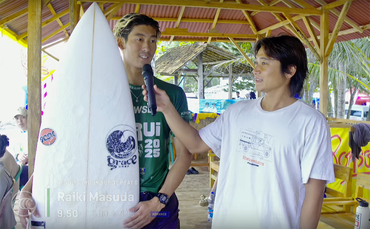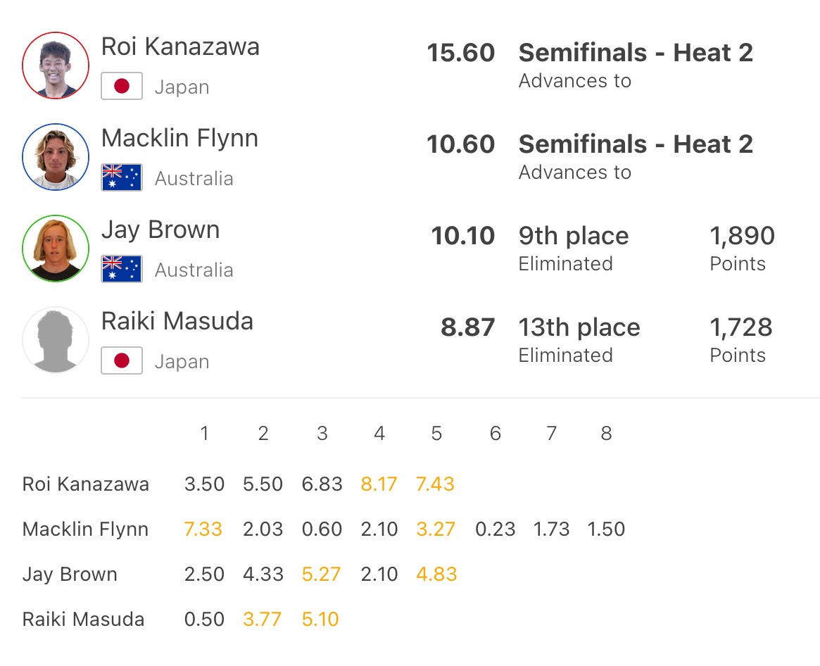 ラストウェイブのビッグ2ターンコンボでエクセレントの8.00をスコアした金沢呂偉、スタートからベストスコアを揃えた増田来希の二人がトップでクオーターファイナルへ進んだ。