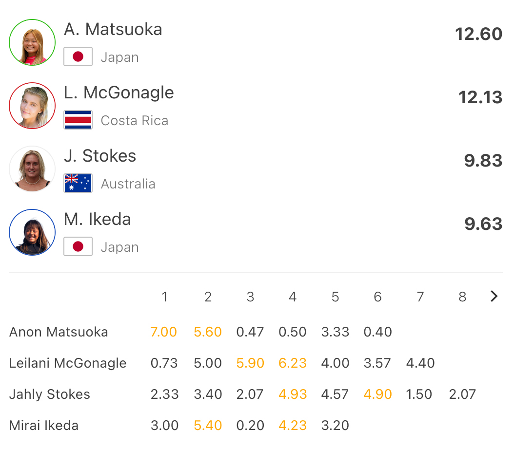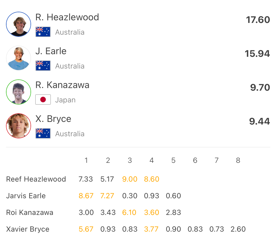 前年王者で元世界ジュニアチャンピオンのジャービス・アール(オーストラリア)も、パワフルなターンで8.67ポイントを出すなど応戦したが、ヘーゼルウッドの勢いを止めることはできず、準優勝となった。