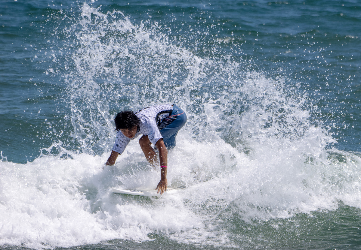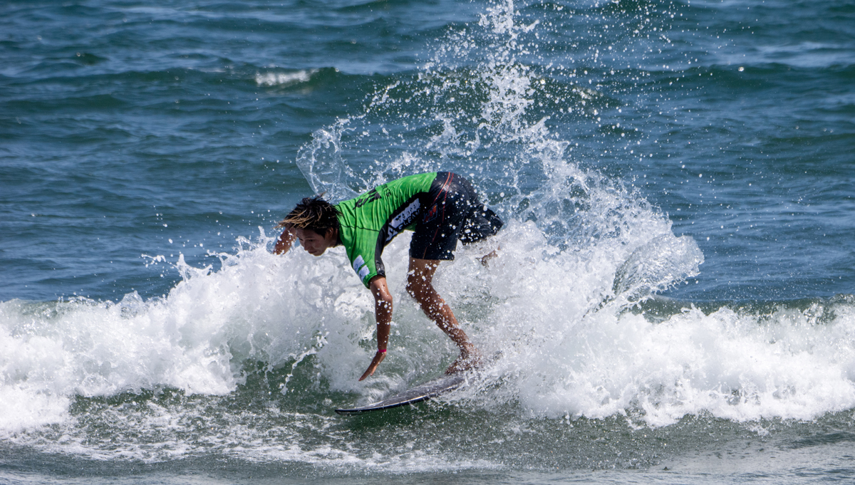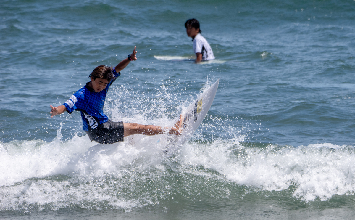 ハイタイドで厳しさを増すコンデイディションの中、岡野 漣はスタートからレフトの波でシャープなバックハンドターンを2発メイク。