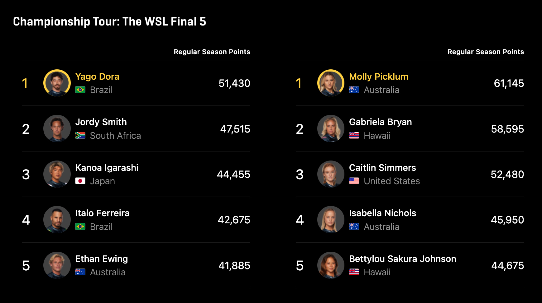 この結果、ドラは WSLファイナル 5 に残り、レクサスWSLファイナルズで世界タイトルを争うことになった。