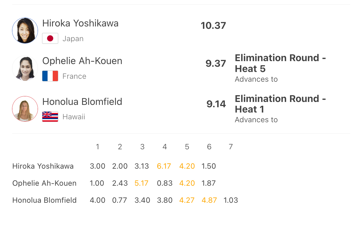 - 吉川広夏: 今日から試合が始まって、日本の明け方だと思いますが、応援してくださった皆さん、ありがとうございました。なんとか勝ち上がることができたので、次のヒートももっともっと頑張っていきます。