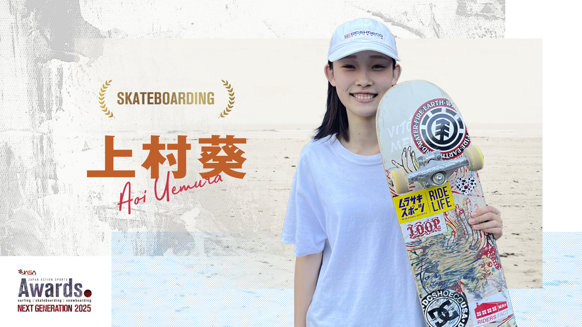 スケートボード女子は、2023年、「楽天UPRISING TOKYO」の女子ストリート部門で優勝。2024年には「STREET LEAGUE APEX Las Vegas」で準優勝、さらには「Rockstar Energy Open」で見事優勝を果たし、2025年「STREET LEAGUE TAKE OVER Santa Monica」でも準優勝という輝かしい成績を残し、ワールドクラスのライダーとして注目を集めていル、上村葵(うえむら・あおい)が受賞。
