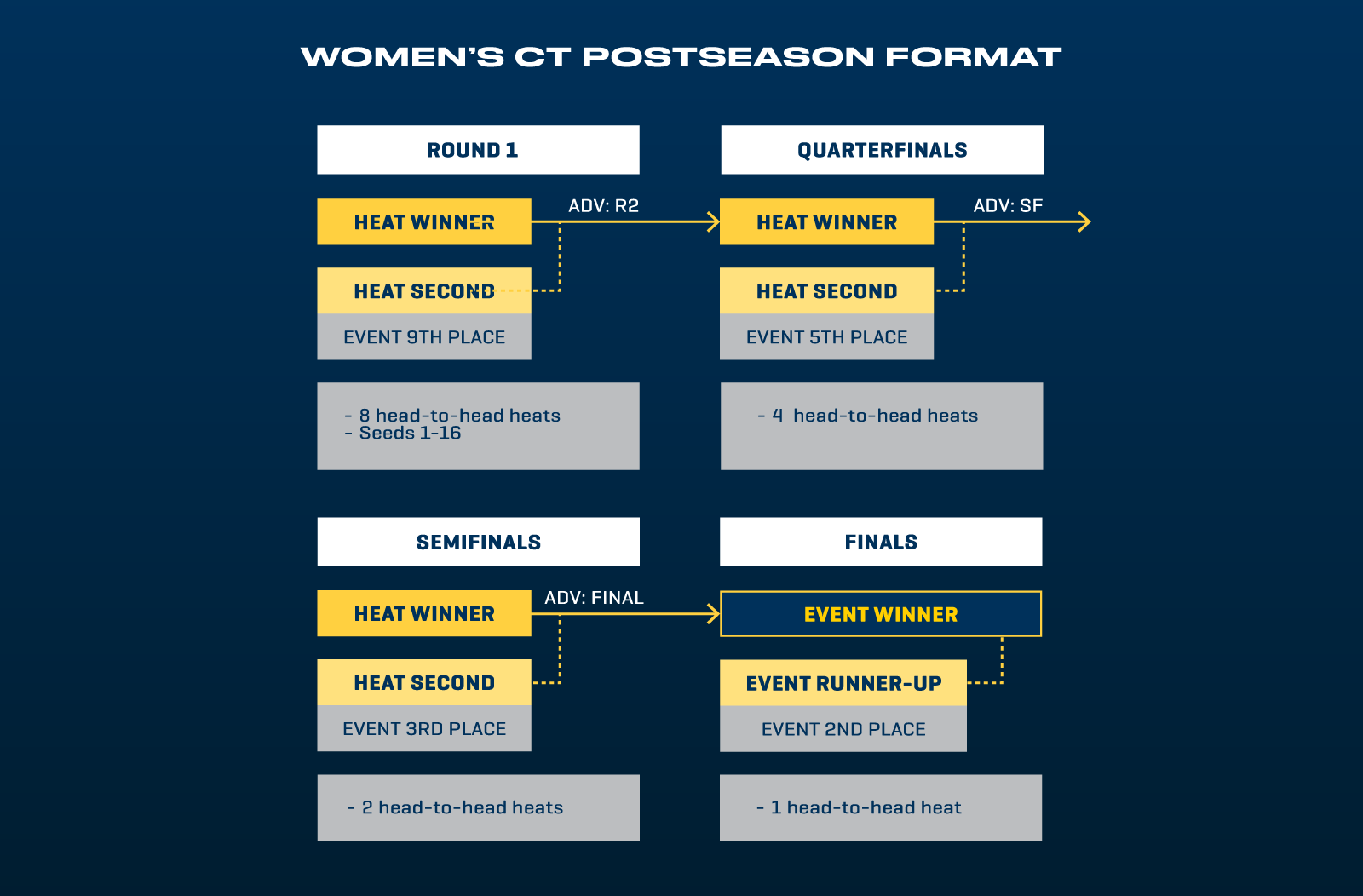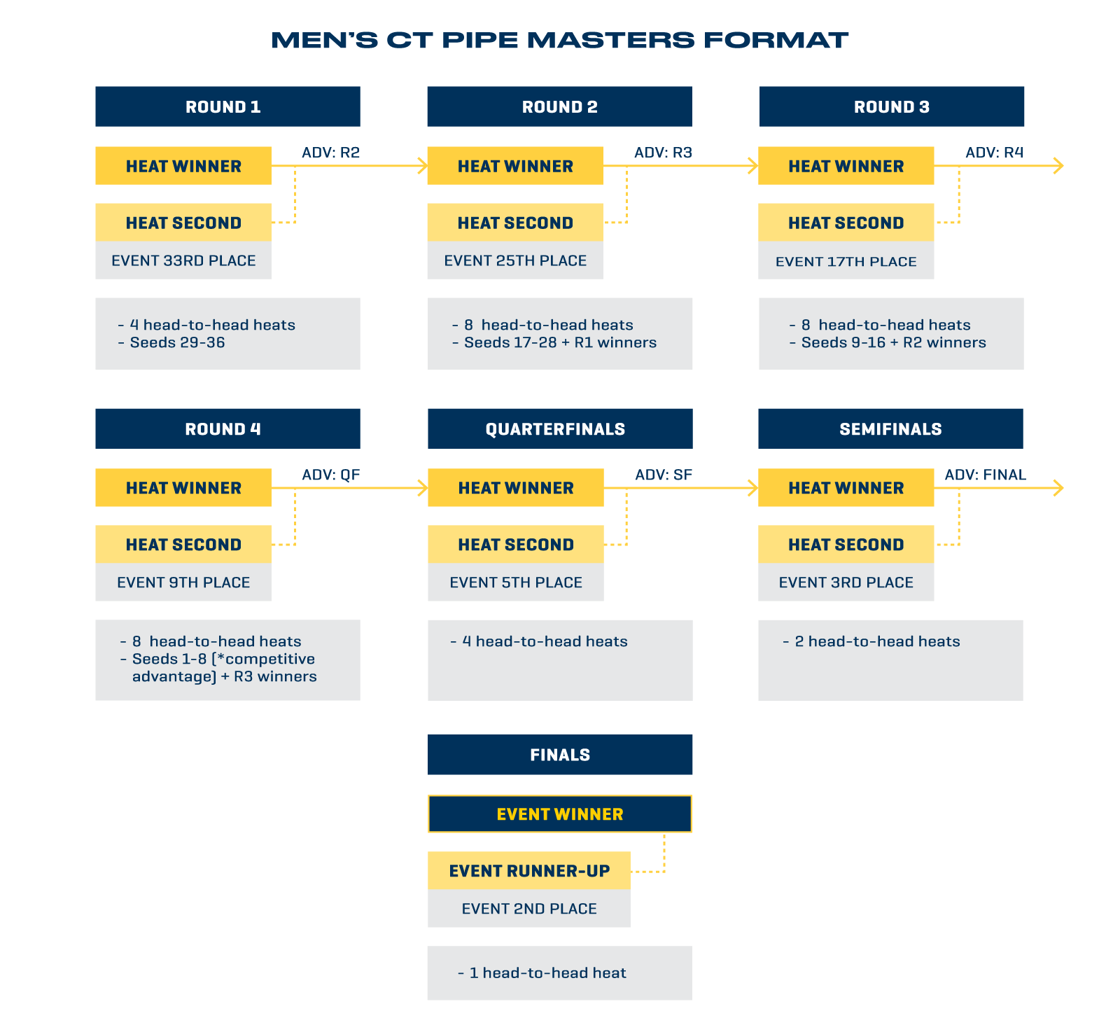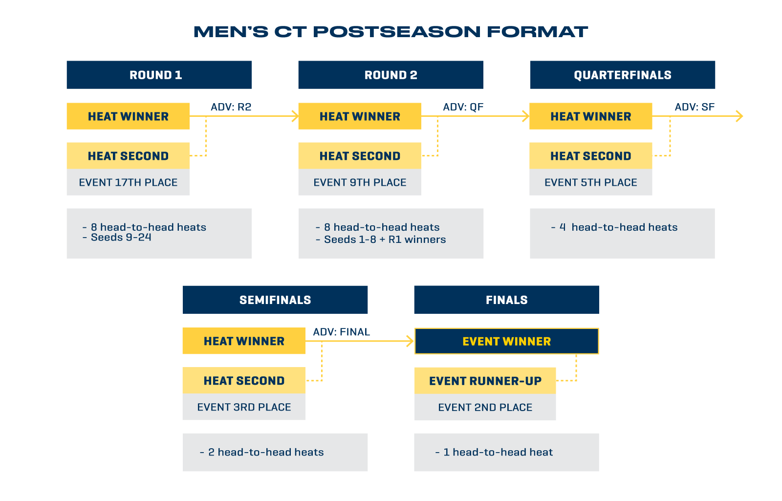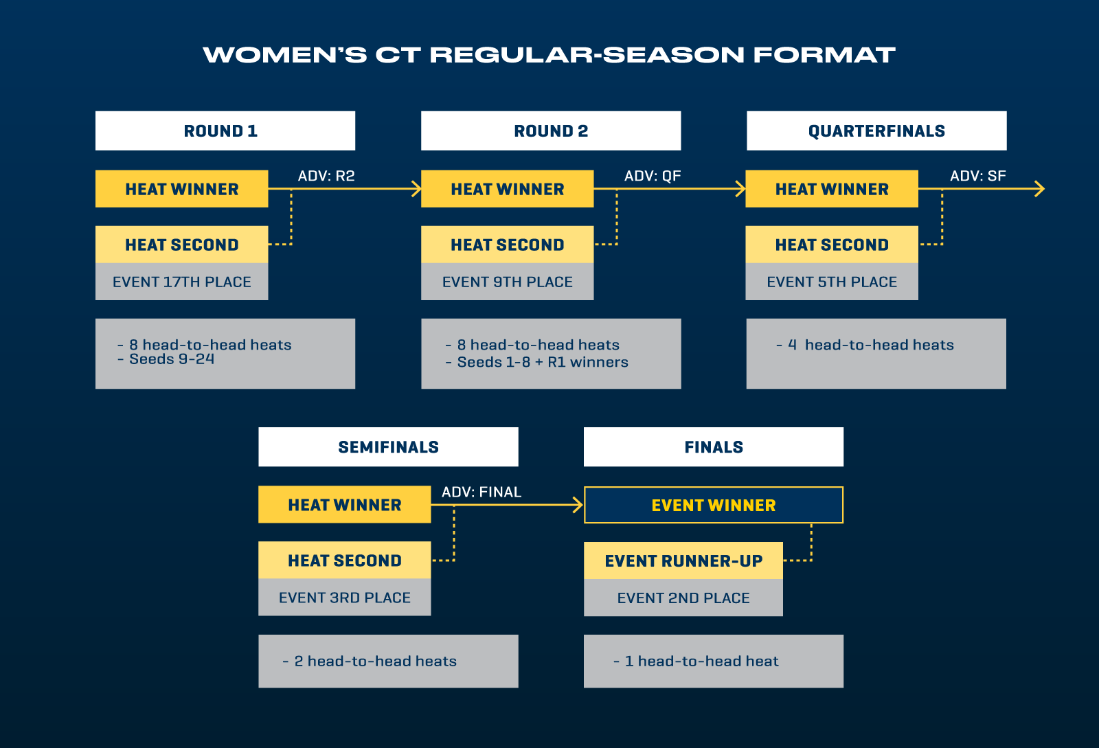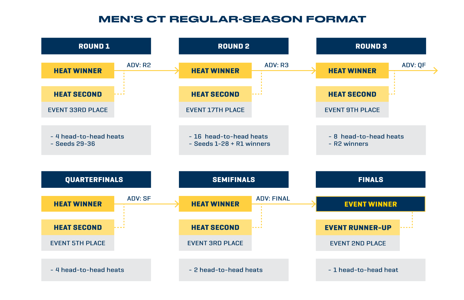 ①レギュラーシーズンイベント、②ポストシーズンイベント、③パイプマスターズでは、男子と女子で異なるフォーマットが採用されるが、最終的には、すべてのイベントのすべてのヒートが、CTでのサーファーの順位に最も重要となる。