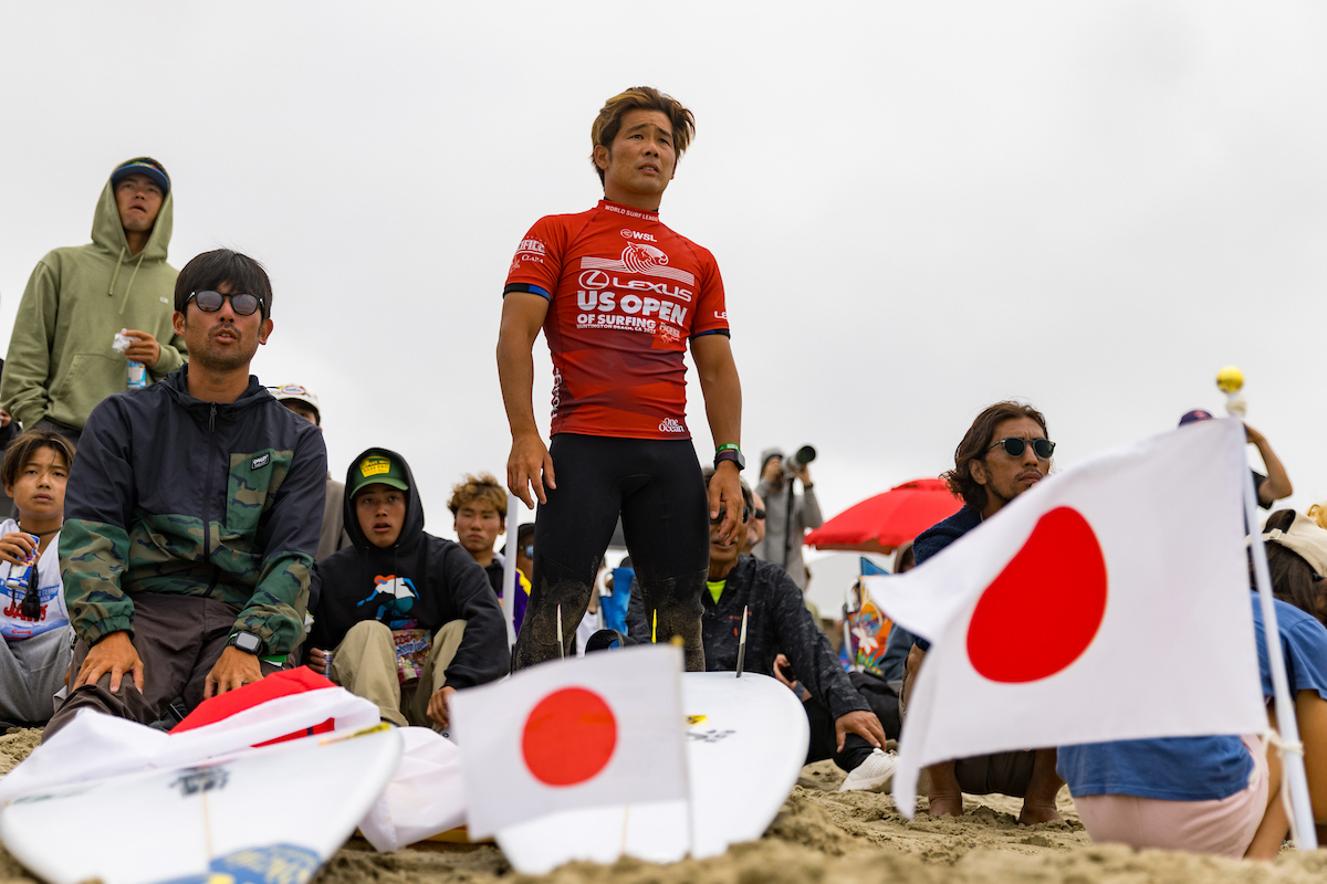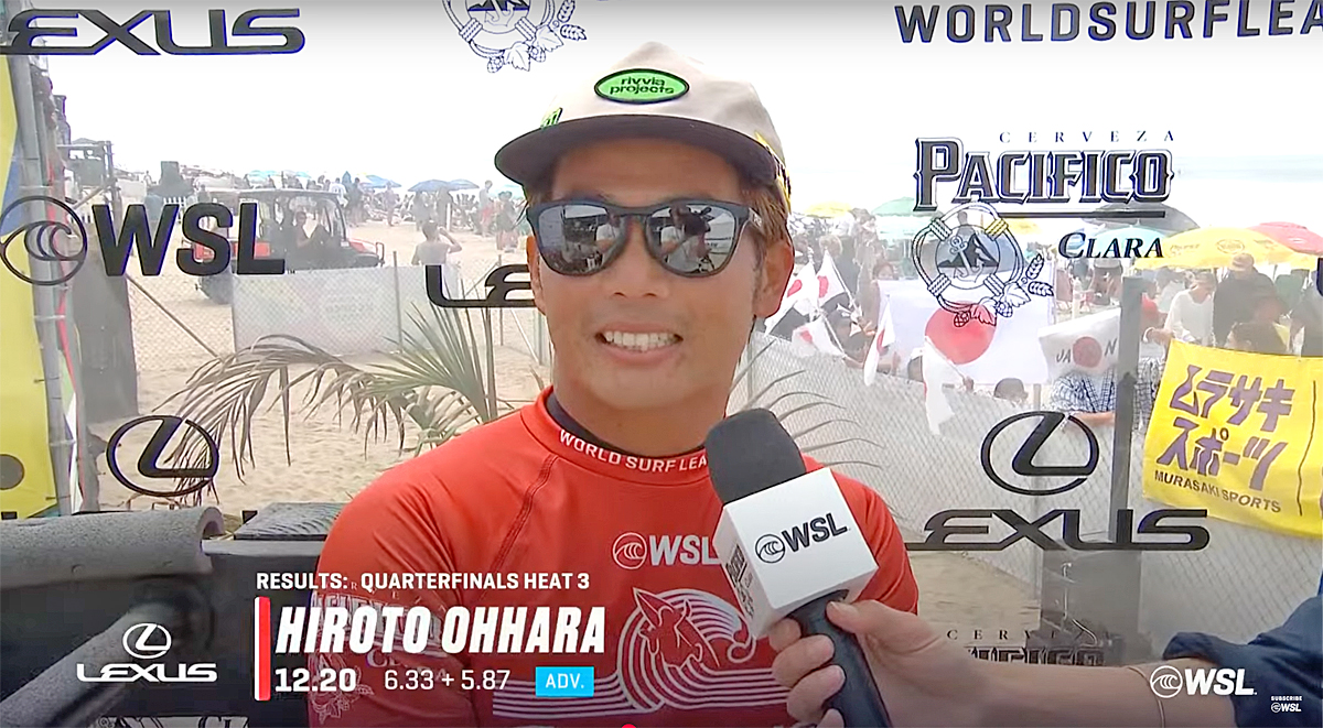 大原洋人:ここはハンティントンビーチで、カリフォルニアですけど、日本の旗がたくさんあって、まるで日本にいるような気分です。ええ、たくさんの日本人が僕を応援しに来てくれています。そして、もちろん、この画面の向こうにもたくさんのファンがいると思うので、本当に感謝していますし、皆さんありがとうございます。僕は、ええ、ただ見せたい、自分のサーフィンを見せて、決勝まで進めたらと思います。