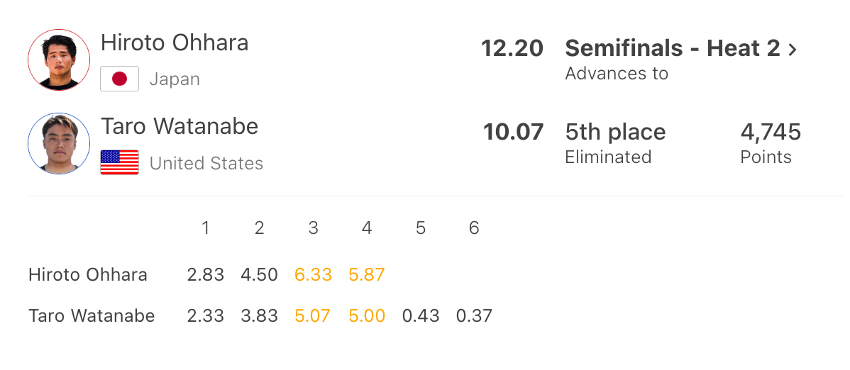 HEAT 3:大原洋人(JPN) 12.20 DEF. 渡部太郎(USA) 10.07