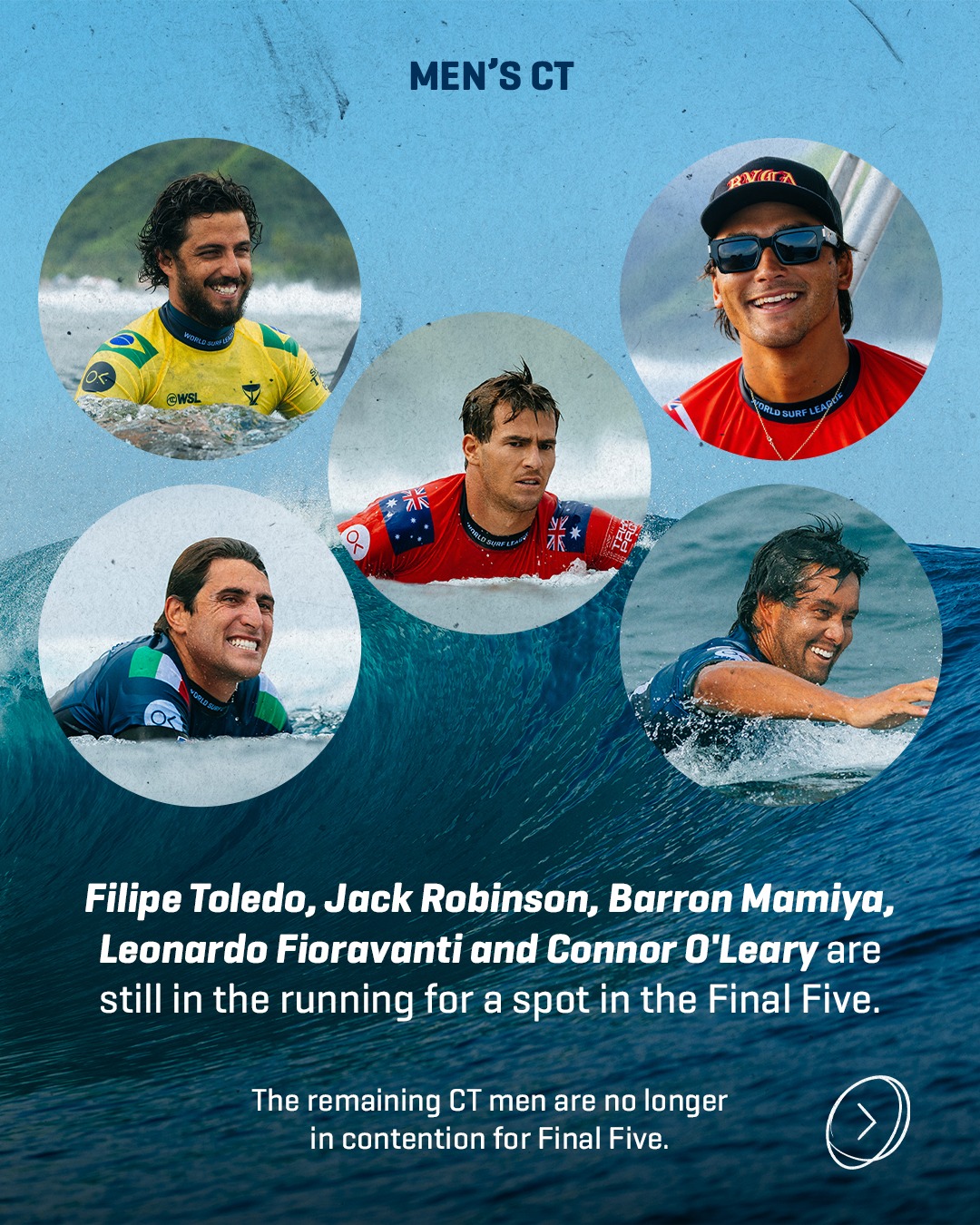 女子ではキャロライン・マークスは、タヒチで優勝すれば、ファイナル 5 への出場権を獲得。残りの CT 女子は、すべてファイナルズ出場権争いを続けている。