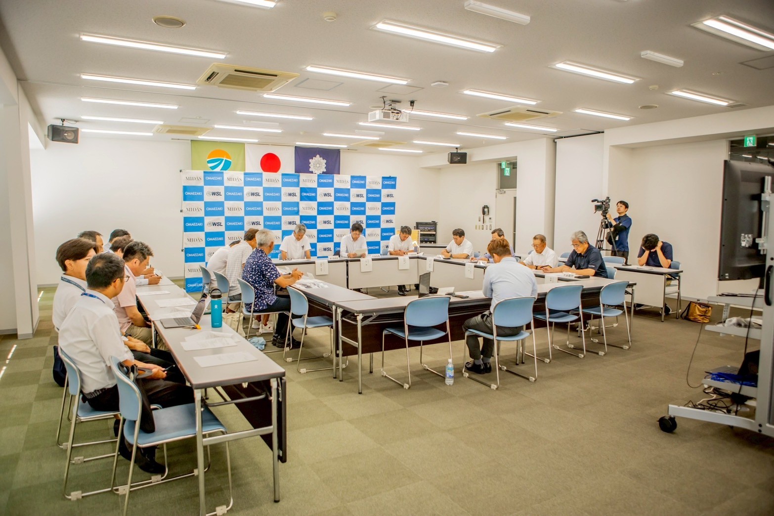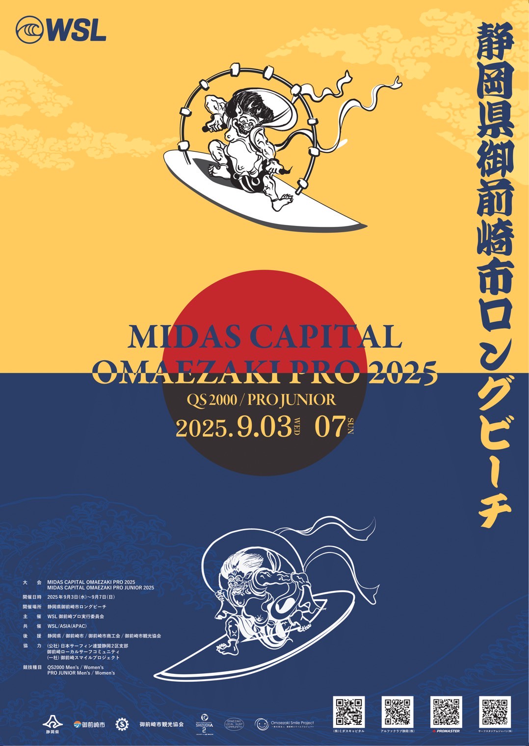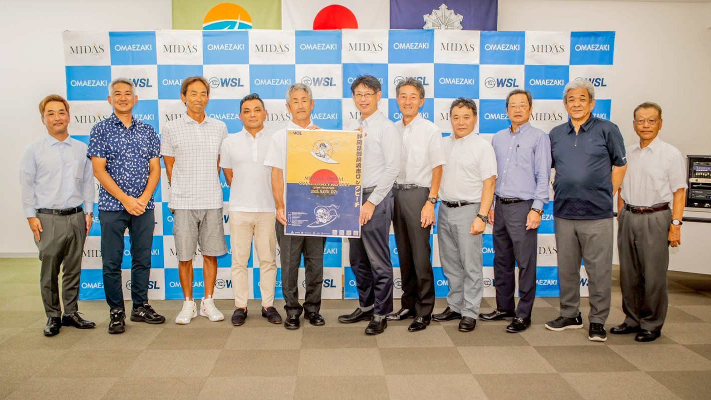 WSL御前崎プロ実行委員会(大会会長:下村勝、実行委員長:小野田政宏)は、令和7年9月3日(水)から7日(日)に、静岡県御前崎市「ロングビーチ」にて、ワールド・サーフ・リーグ男女QS2000&PRO JUNIORイベント「MIDAS CAPITAL OMAEZAKI Pro 2025」を開催することを発表。関係者による記者会見が行われた。