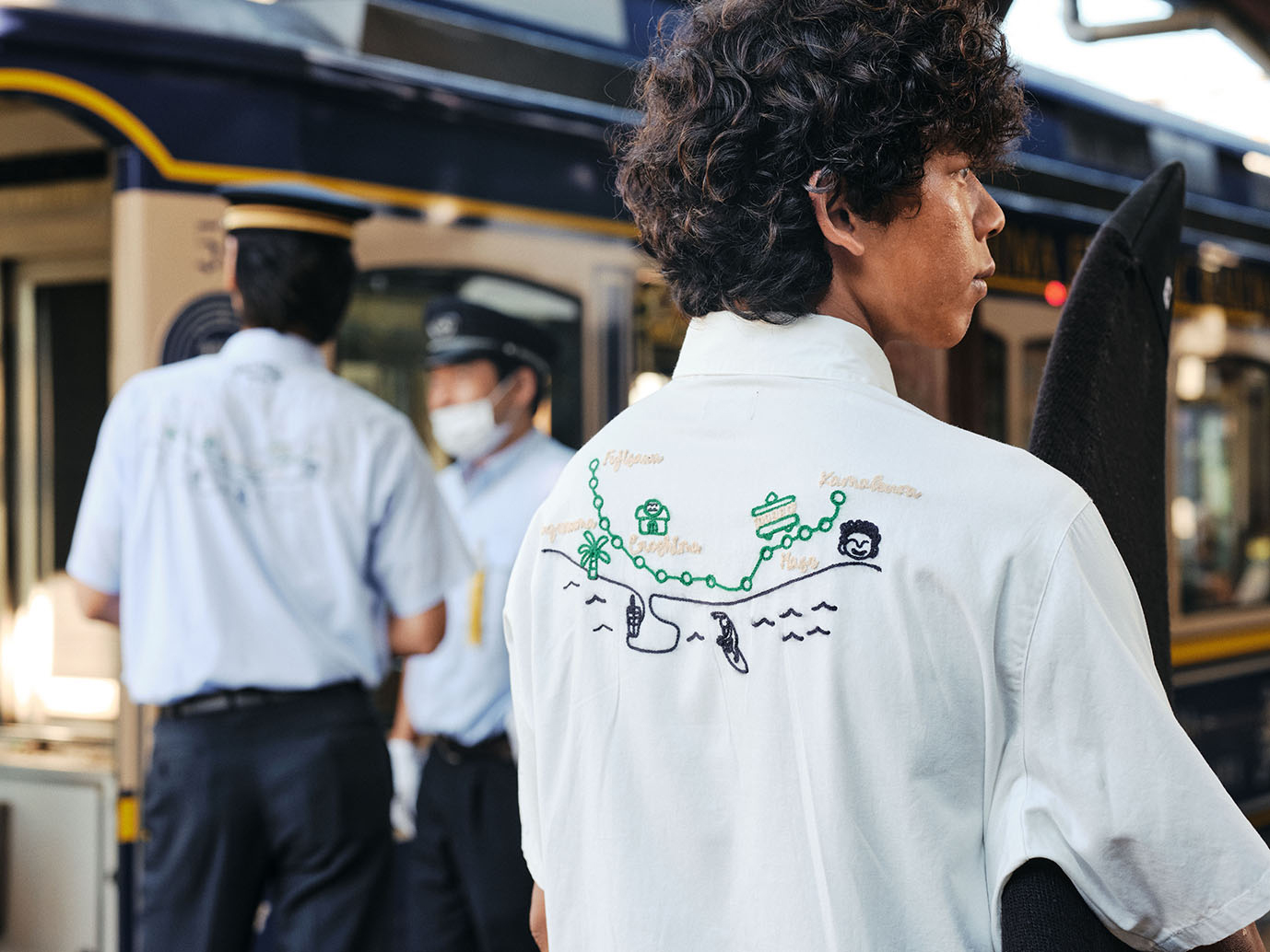 江ノ電乗務員が着用する”コラボ制服”シャツは、胸と袖にコラボワッペンをあしらい、背中には手書き風の江ノ電路線図が刺繍されたこだわりのデザイン。