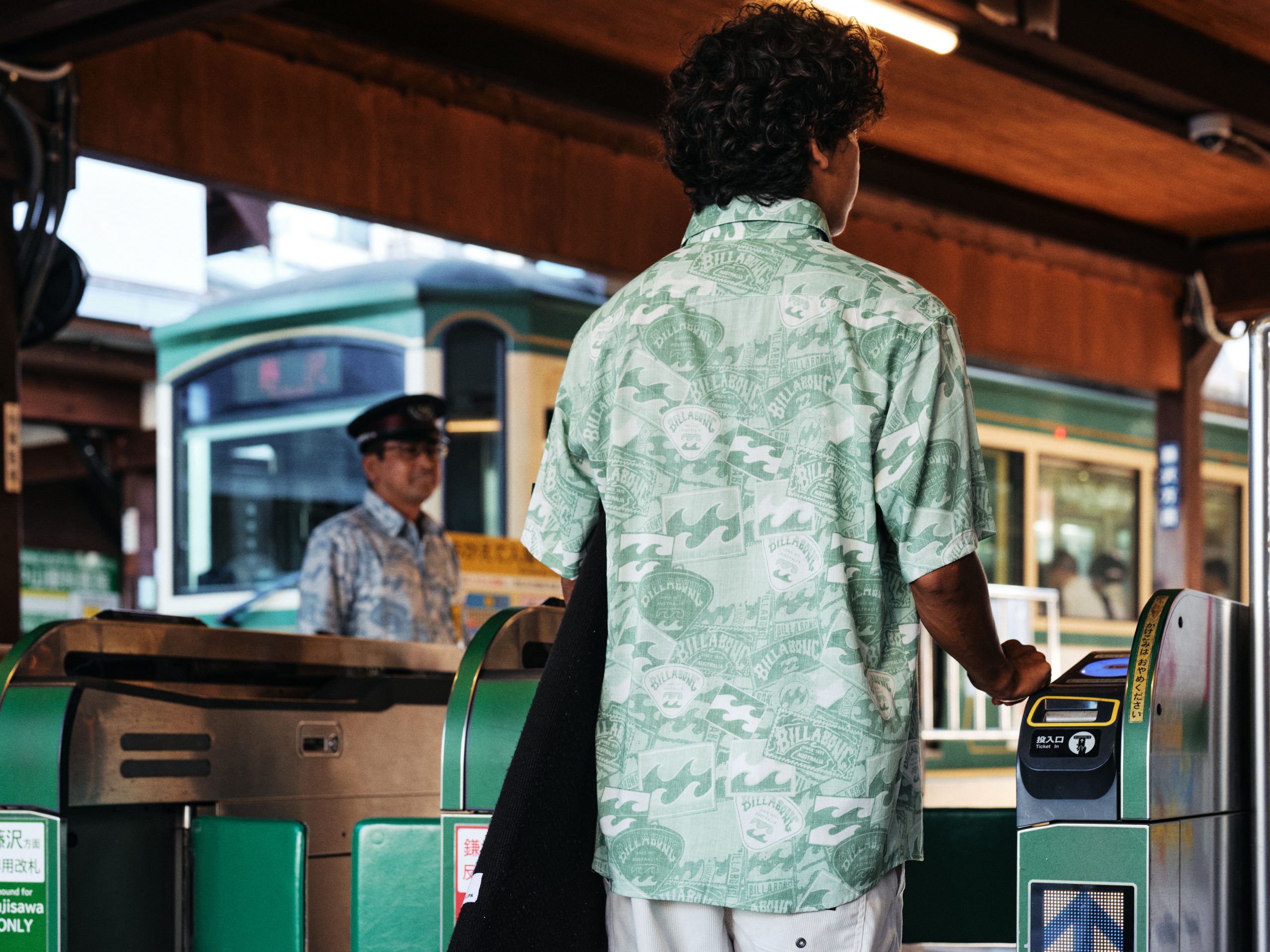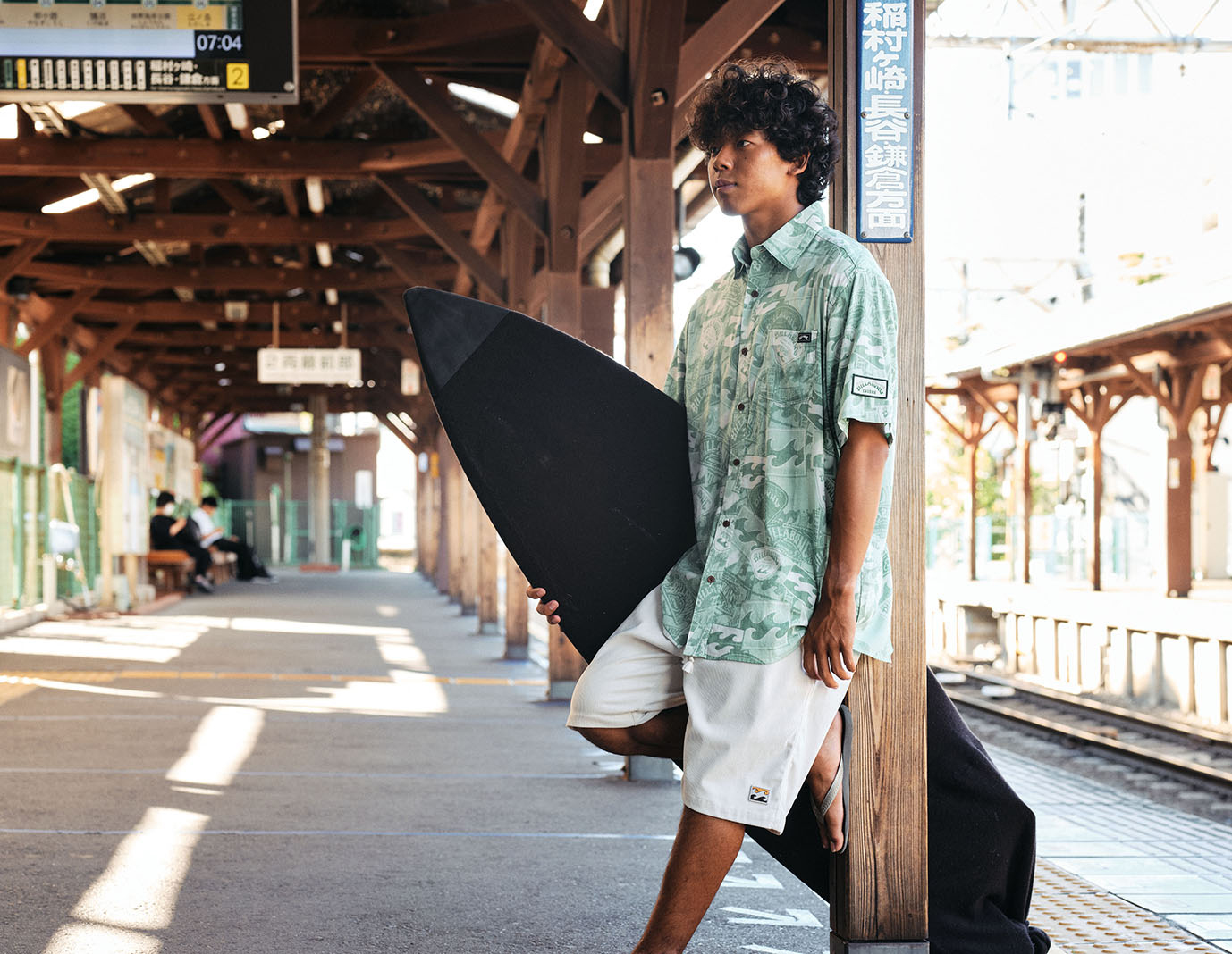 また、駅員や売店スタッフが着用する、BILLABONGの歴代ロゴがコラージュされた総柄デザインのシャツも同時に発売される。Tシャツやキャップ、トートバッグなどを含め、全11型の多彩なアイテムがラインナップされる。