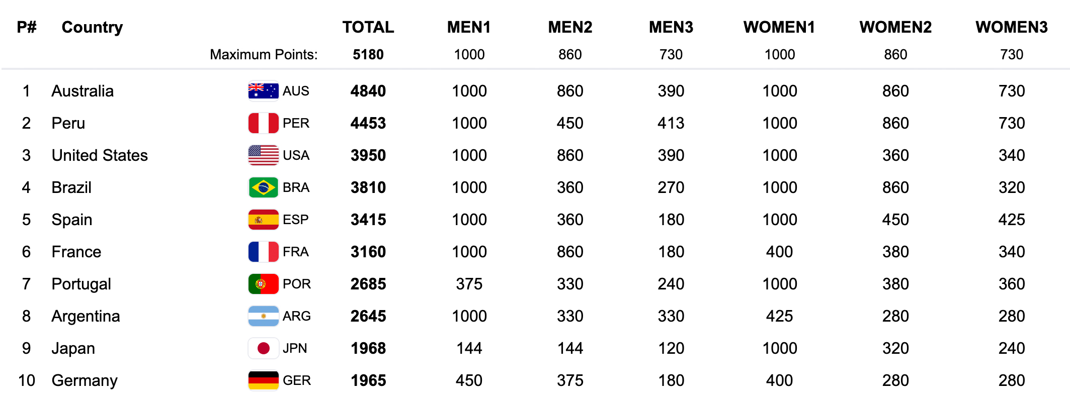 ペルーは現在 2 位、USA、ブラジル、スペインは順位を争っているが、トップ 5 を維持している。日本は9位に浮上。