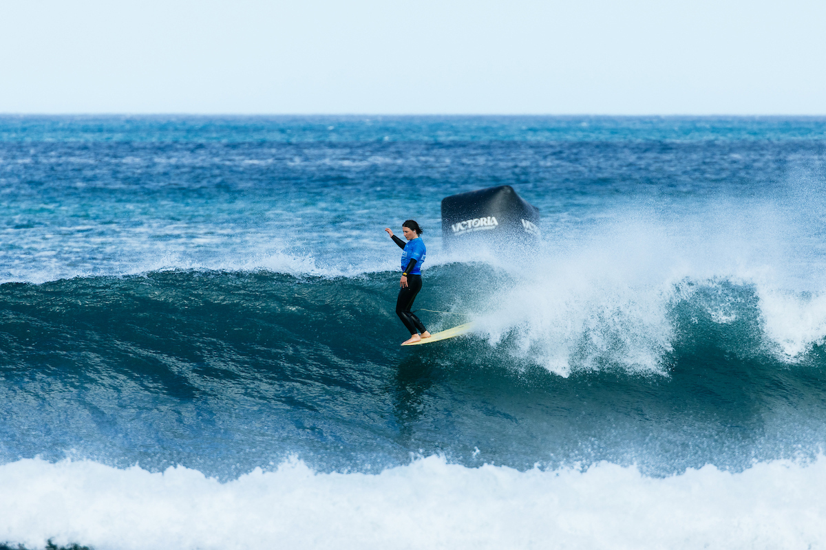 ビクトリアン・ロングボード・タイトルズで優勝し、ローカルワイルドカードを獲得したコンロイ。この波をよく知る彼女は安定感のあるサーフィンで7.50 をスコア。4.83でバックアップしてヒートリードした。