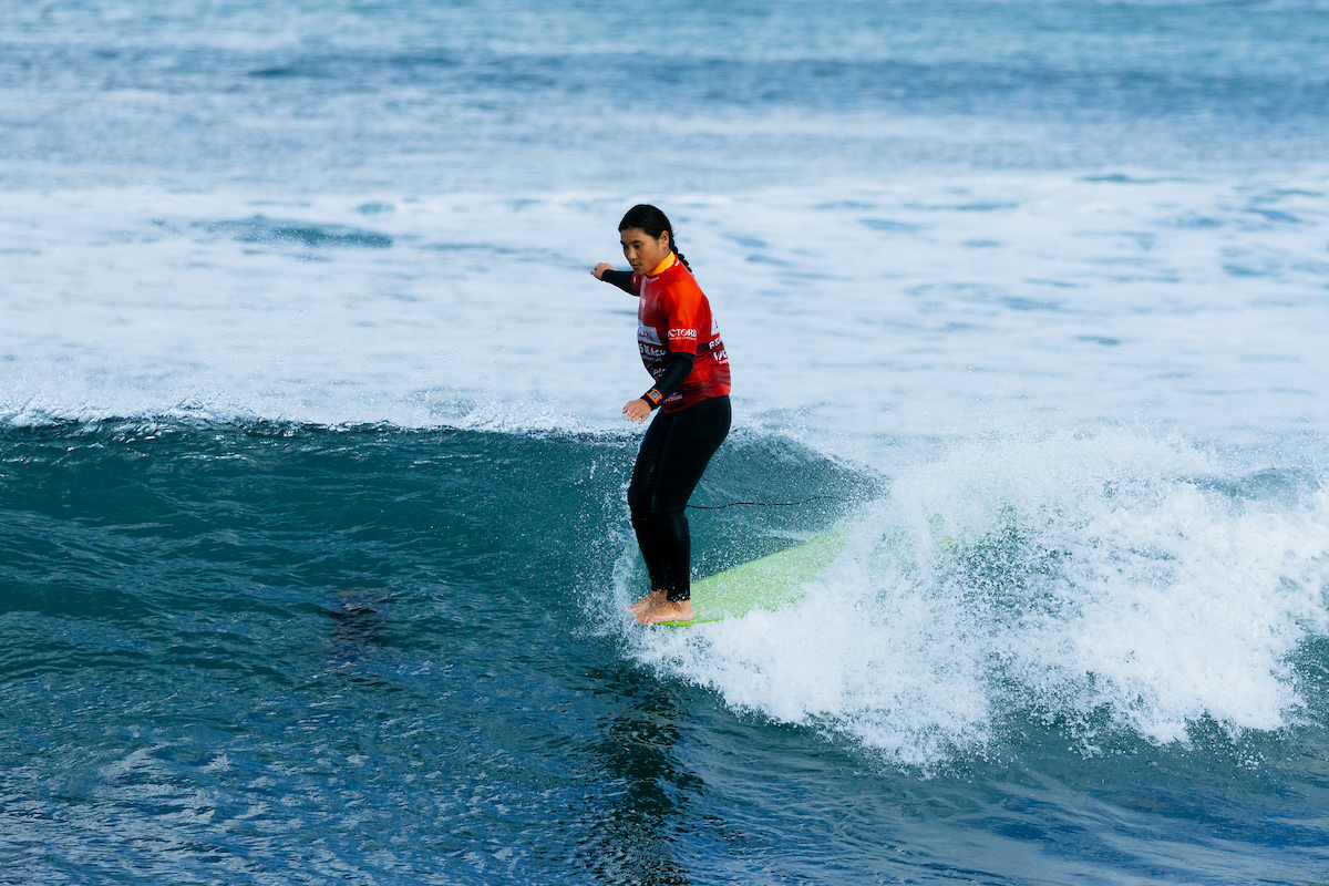 13歳のイタリアの若き天才ジンジャー・カイミ(イタリア)は、WSLロングボードツアー2度目の出場ながら、まるでホームグラウンドのように波を切り裂き、ハングテンを決めて10.50ポイントのヒート合計を記録。ヌーサのキラ・モルナー(AUS)を破って勝利を収めた。