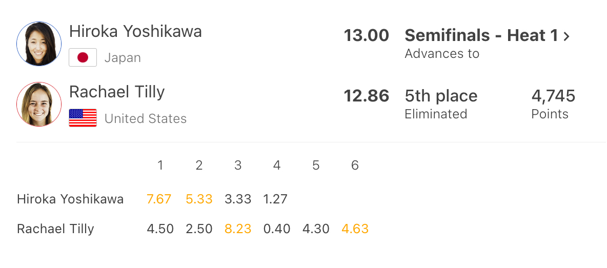レイチェルもビッグセットでハングファイブオーバーをメイク。流石の世界チャンピオンらしいライドでエクセレントの8.23をスコア。しかしバックアップが4.63と低いレイチェルは2位でヒート終盤。ヒート終了間際に逆転をかけて波に乗ったレイチェルだったが、僅差で吉川が逃げ切り、見事セミファイナル進出を決めた。
