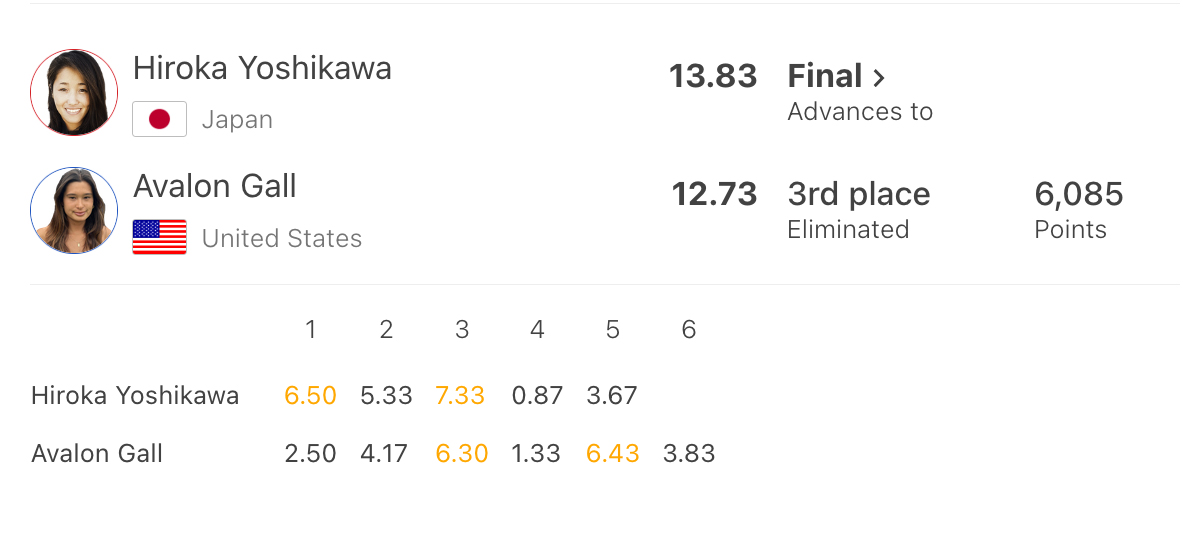 セミファイナルでは、USAオープン覇者のアヴァロン・ガル(USA)と対戦。吉川広夏は今回も先制攻撃を仕掛けて、クリティカルなノーズライドのコンビネーションで6.50をスコア。