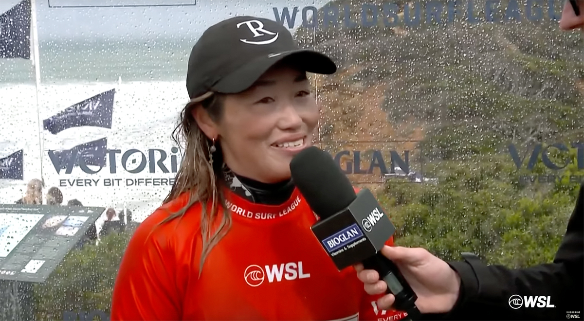 オープニングラウンドとラウンドオブ16を勝ち上がり、ファイナルデイに駒を進めた。ラウンドオブ16ではハワイのナタリア・ワンダーリッヒ(HAW)と対戦。ラストライドでインサイドで揉まれまくり、フィンが足にあたりウエットが切れるトラブルも修正して前に進んだ。