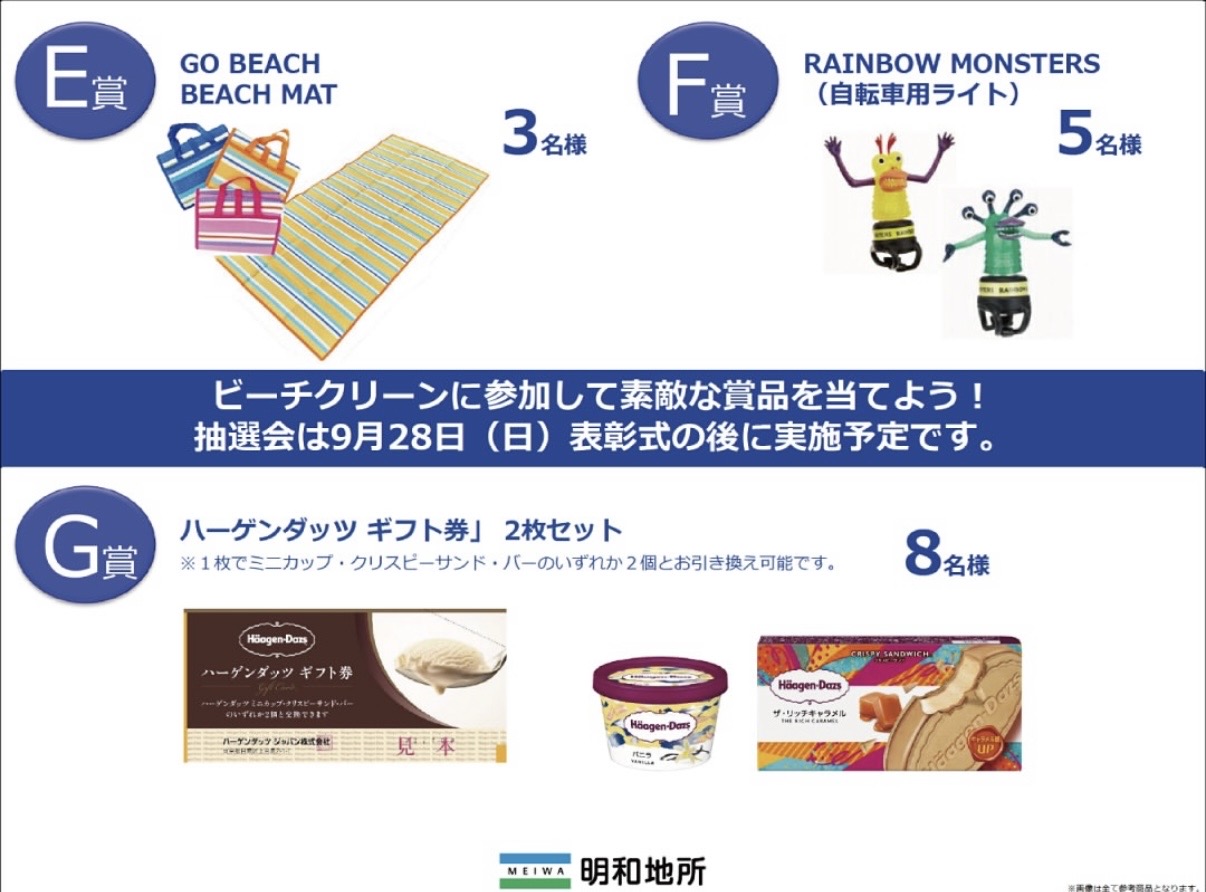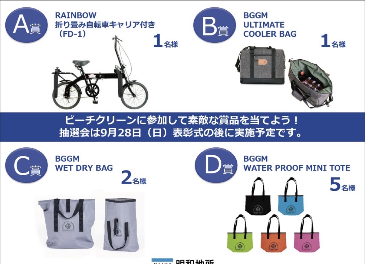 9/28(日)にはビーチクリーンに参加して、豪華商品をゲットしよう!抽選会は表彰式の後に実施予定。賞品ラインナップは RAINBOW 折り畳み自転車(キャリア付き)やBGGM ULTIMATE COOLER BAG、BGGM WET DRY BAG、BGGM WATER PROOF MINI TOTEなど盛りだくさん。ビーチをきれいにして、素敵な商品をゲットしよう!