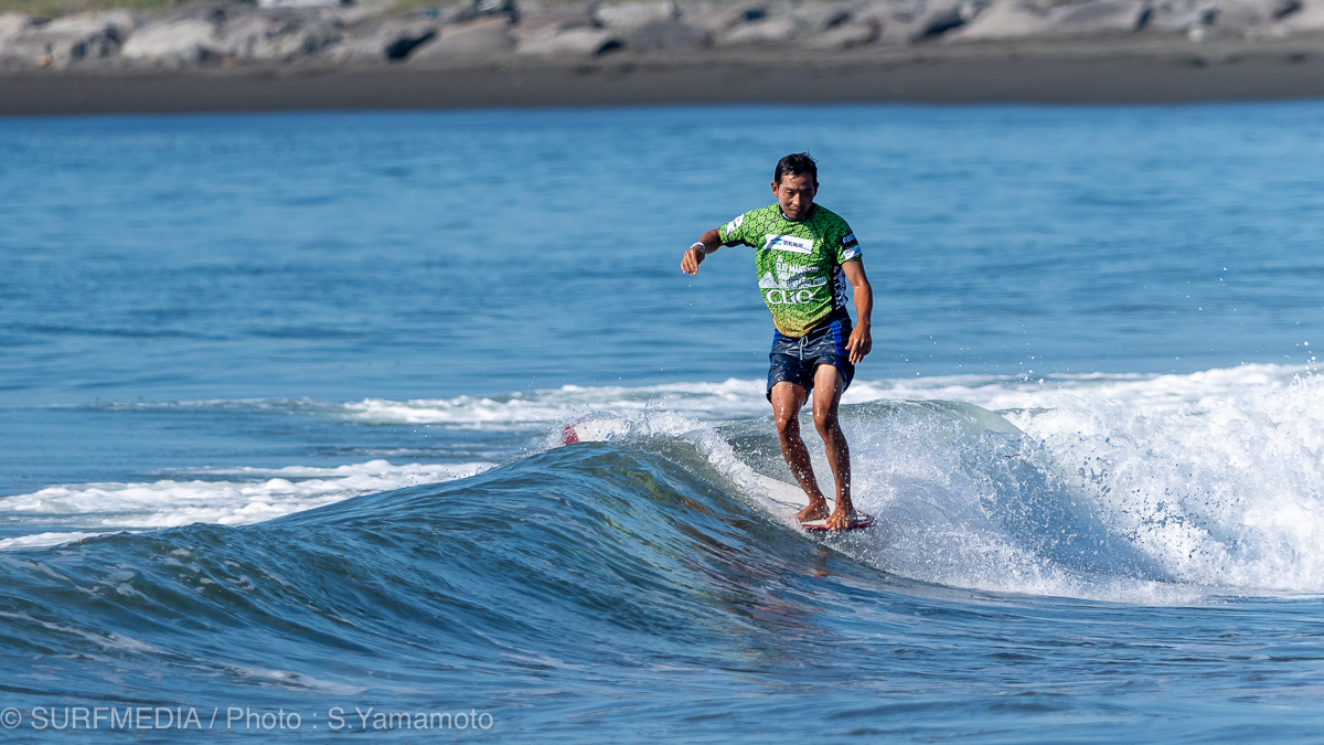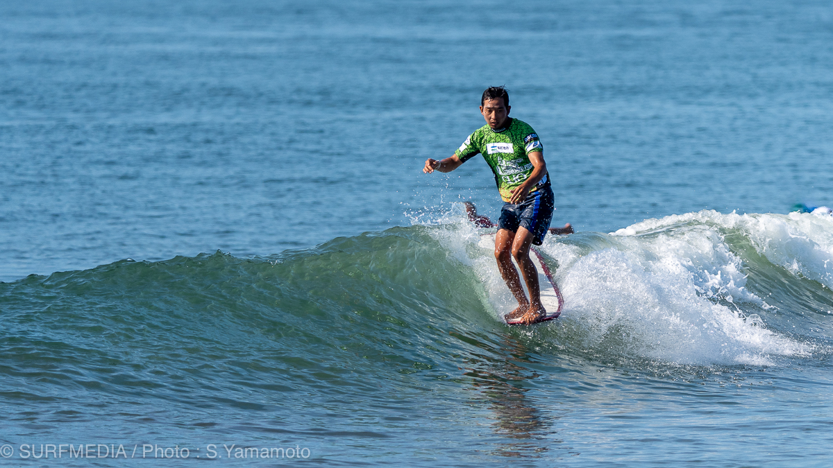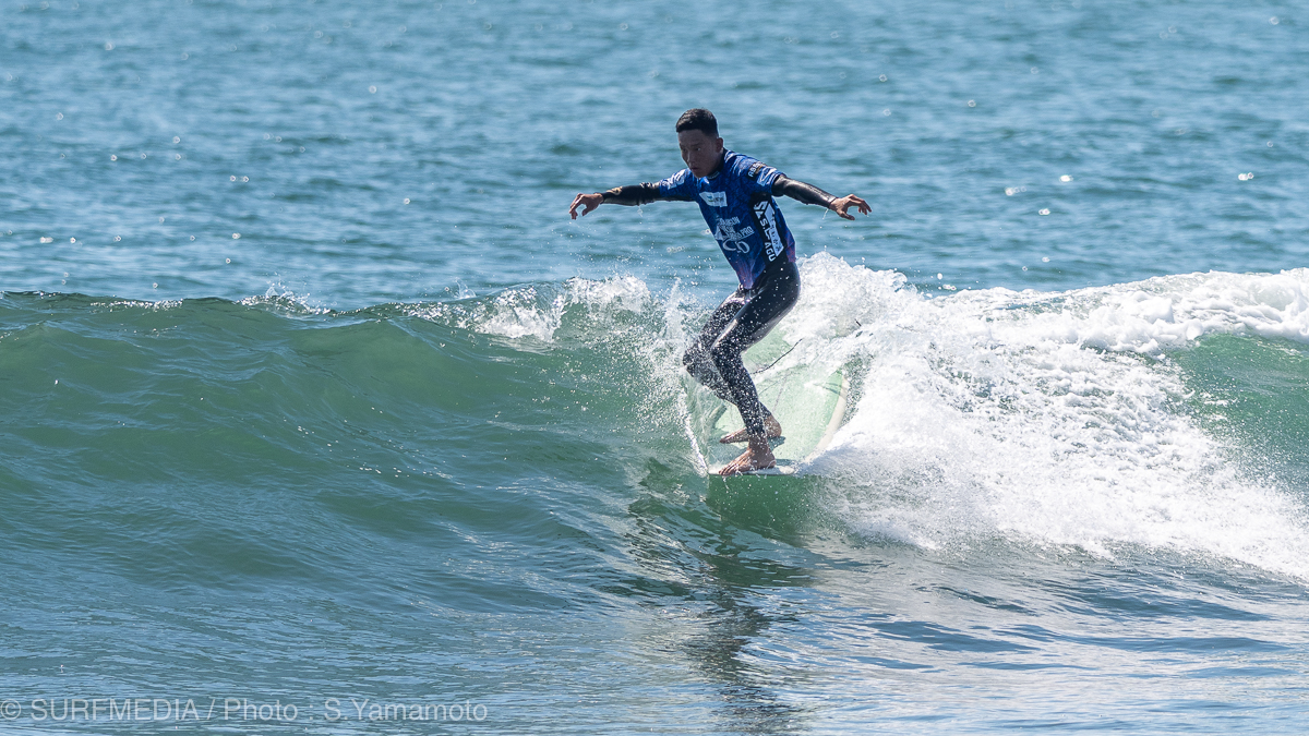 本日の会場は快晴。朝は無風で、潮が上げる時間帯にはヒザ〜モモのサイズ。引きに入るとコシ程度まで上がったが、午後からはサイドの風が入り、面が乱れるコンディションとなった。ブレイクはワイドでダラつき気味ながら、ライト方向の波では比較的長く乗れる場面も見られた。総じて波の選択が勝敗を大きく左右する一日となった。