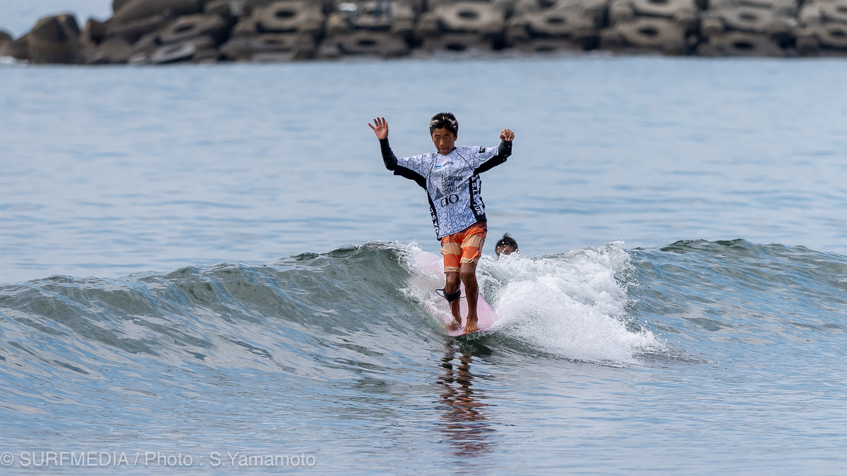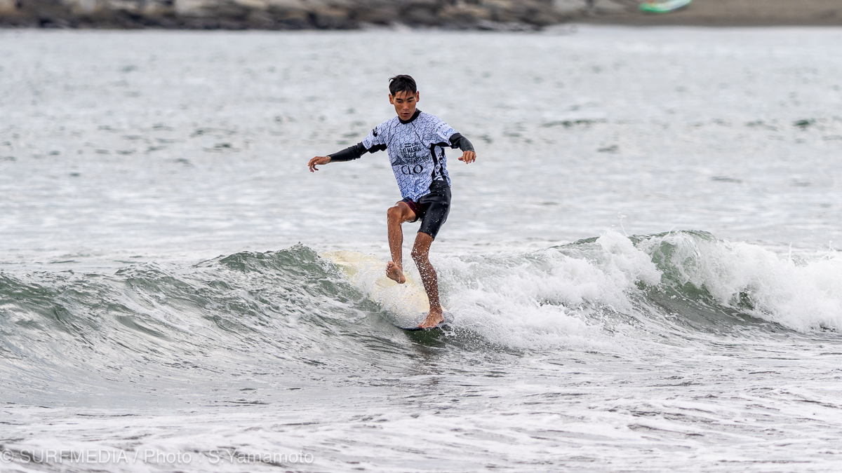 ヒート2は《S.TWO》の櫻井凰太と13歳の長谷川漣。昨日は手数で魅せた二人だが、この日は波が厚く、技を決め切るには難しい展開。波に乗れそうだったら乗るスタイルの長谷川だったが、ショートライドが続く。ここは櫻井が一枚上手だったか。わずかな差で勝負を制し、決勝へ駒を進めた。