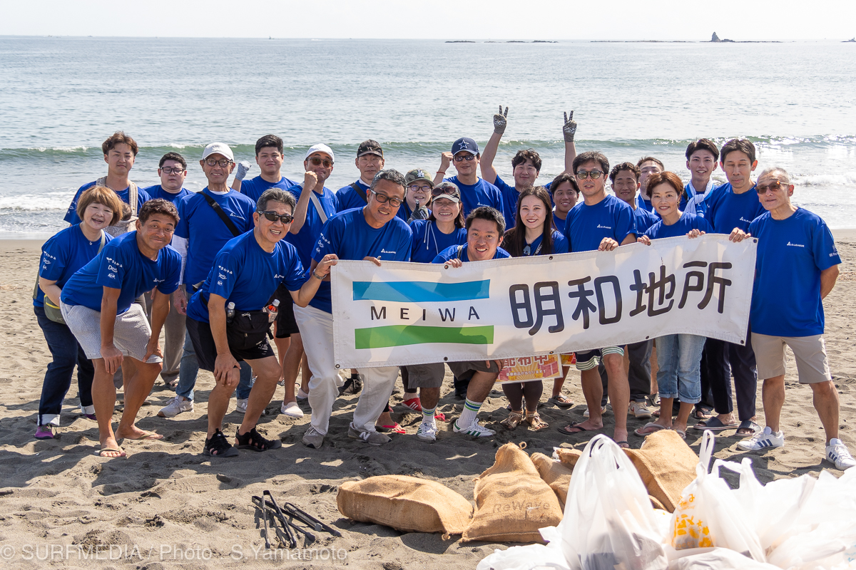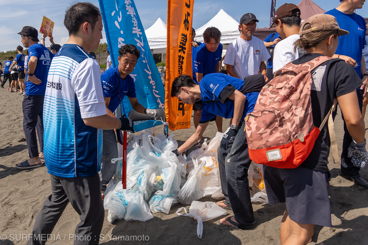 冠スポンサー・明和地所が主催するビーチクリーンには、来場者、選手、スタッフが一体となって参加し、プラスチックごみを回収。
