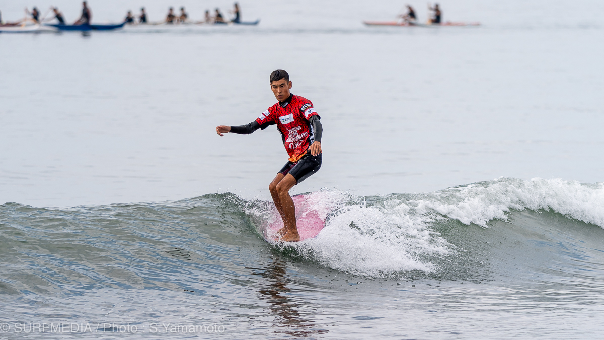 波はヒザ前後。風はサイドから吹き、速めでワイドなインサイドブレイク。コンディションは決して良いとは言えないが、セットを掴めば勝負ができる。ただしセットの間隔はばらつきがあり、波を選ぶ判断力と、限られたチャンスをものにする集中力が試される一日となった。