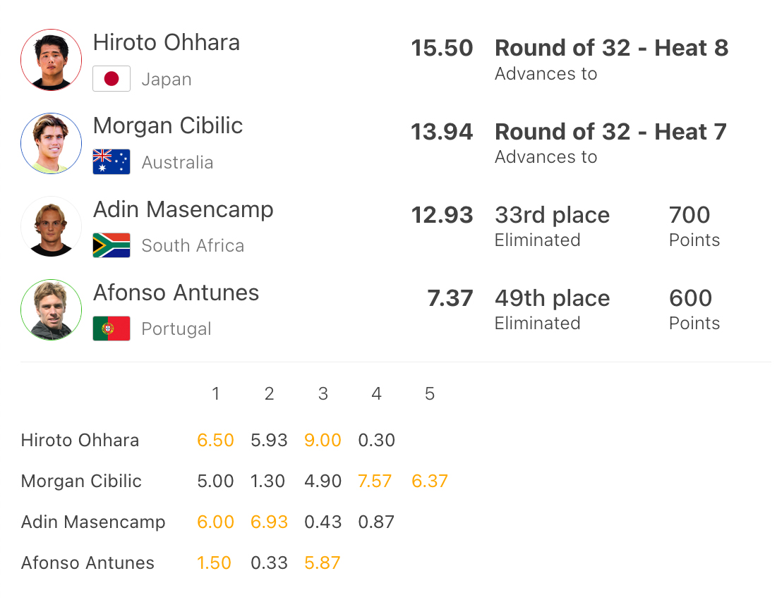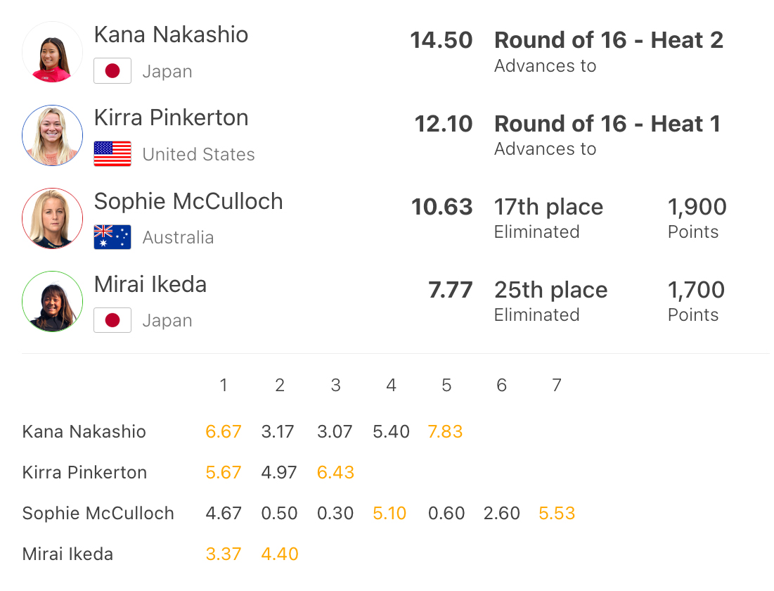 野中美波は6.33をスコアするなど好調なキレのある攻めのサーフィンで、最後まで2位をキープした。しかし、ヒート終盤にサノア・オリンが7.67をスコアしてトップにジャンプアップ。野中は逆転されて惜しくも敗退。今大会は17位でフィニッシュとなった。