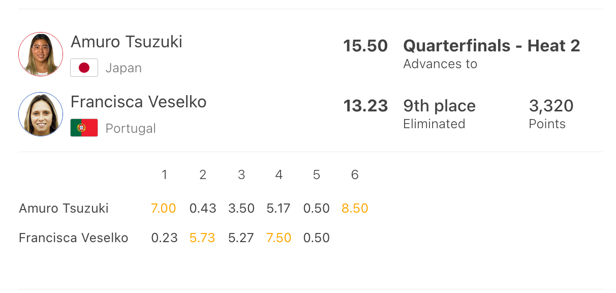 H3では都筑有夢路が、フランシスカ・ベセルコ(POR)と対戦。都筑はインサイドでダブルアップする波を掴みスタートから7.00のハイスコアを叩き出す。都筑はバックアップを3.5としてヒートをリードしていく。