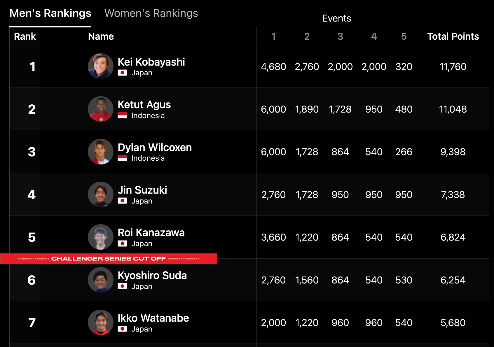 前戦の宮崎大会の結果から2025/2026 WSLアジアQSランキング男子は、小林桂がケトゥ・アグス(INA)を逆転してトップへ。3位のディラン・ウィルコクセン、4位の鈴木仁は変わらず。女子は中塩佳那が首位、松岡2位、鈴木莉珠3位は変動なし。