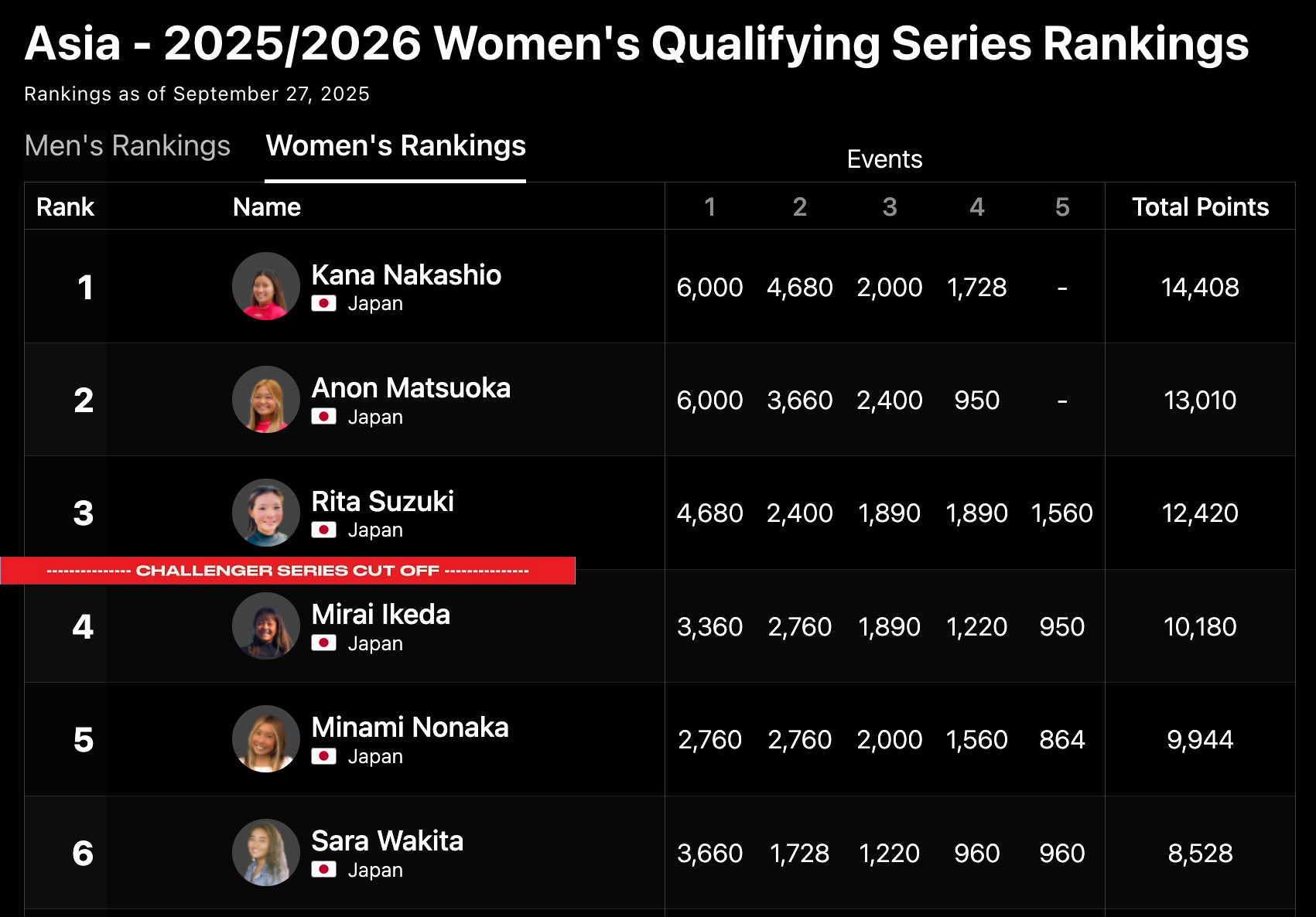 Asia – 2025/2026 Women’s Qualifying Series Rankings(9/27付)