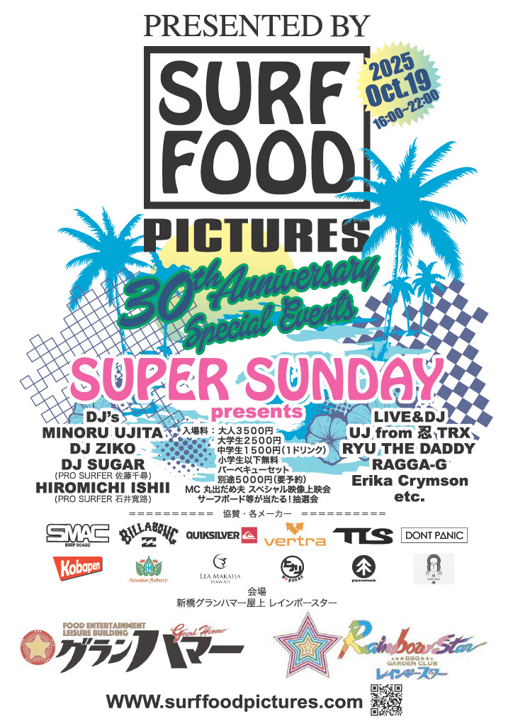 大阪で大盛況だった、数々のサーフムービーヒット作をリリースしてきたサーフフード30周年記念イベントが東京で開催決定。10月19日(日)16時~22時 レジェンドDJ宇治田みのるさんプロデュースのSUPER SUNDAYにて開催される。