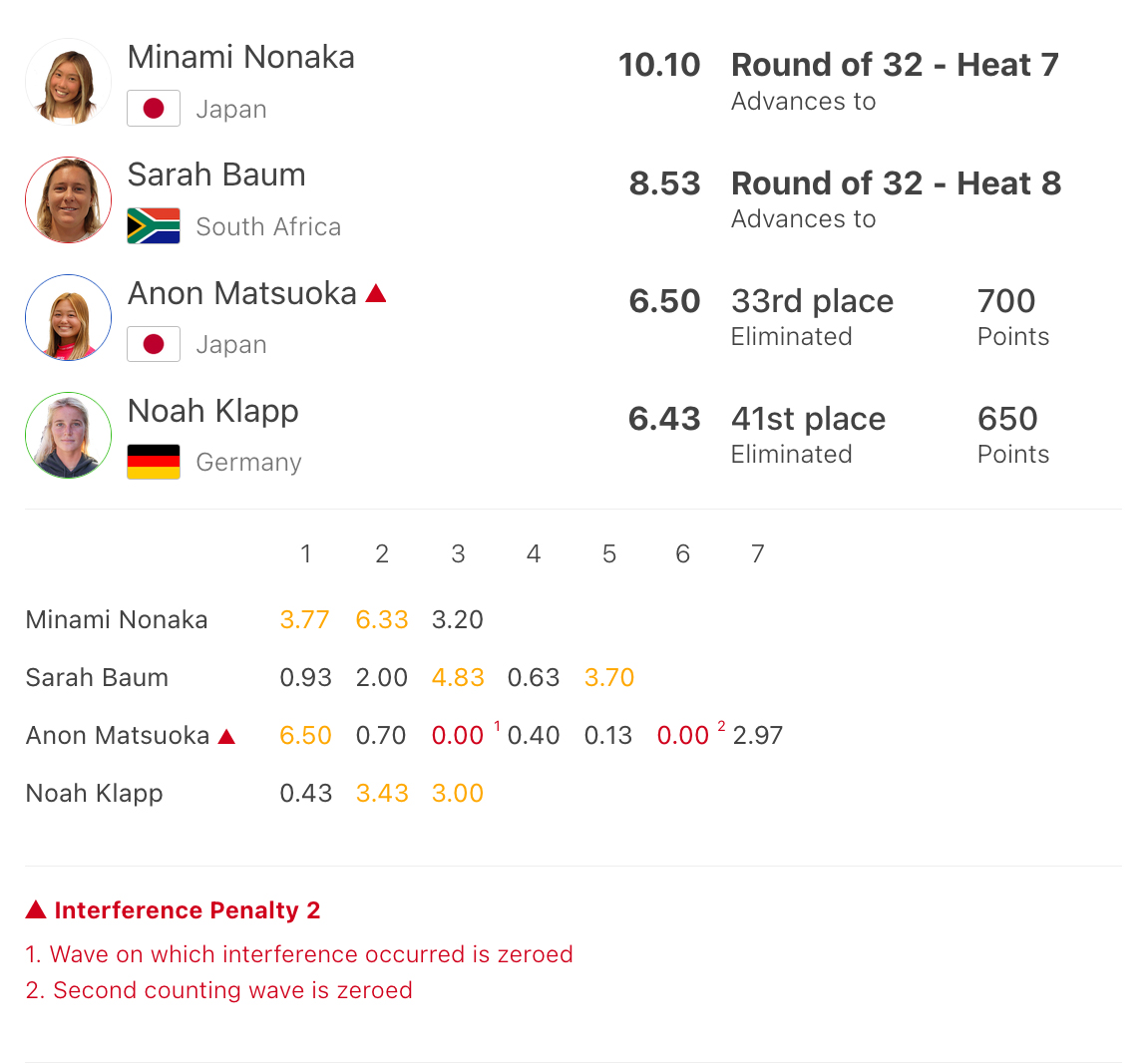 しかし、ヒート中盤にグリーンのノア・クラップと波を取り合った松岡がインターフェアを取られるトラブルが発生。セカンドウェイブをカットされるという手痛いペナルティを科せられた。