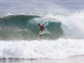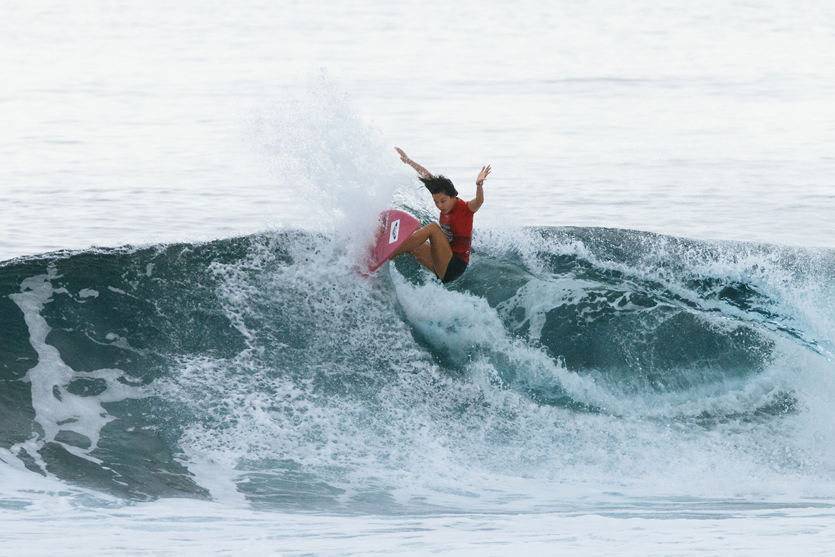 佐藤李はじっくりと波を待ち、ビッグドロップからポケットでのビッグターンを決め、5.83というハイスコアをマーク。2位のポジションにつける。