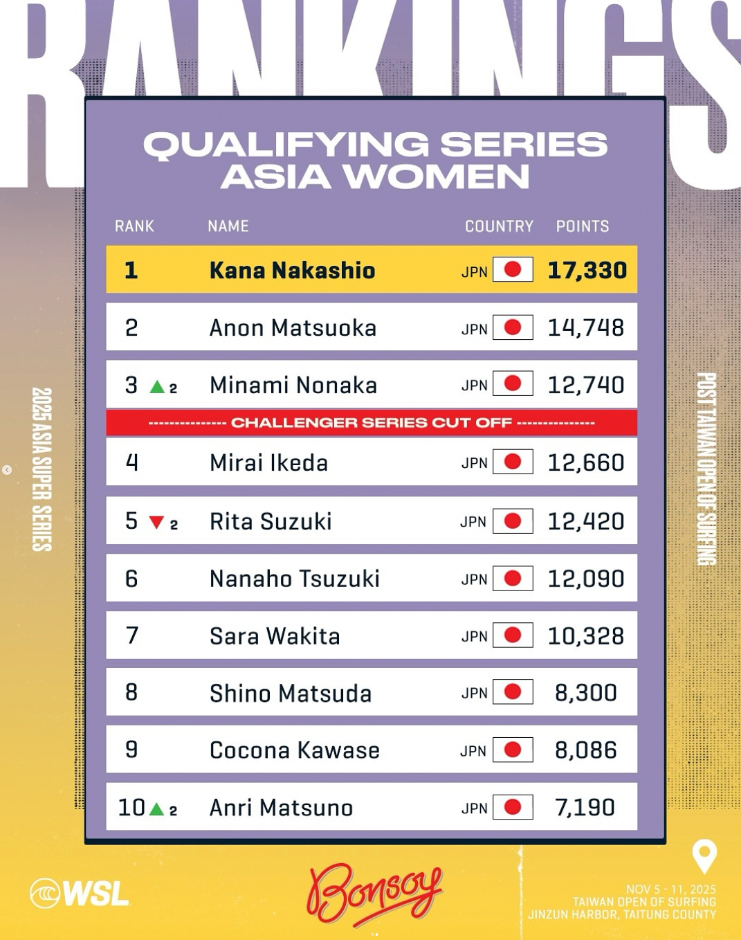 台湾オープンが終了し、小林桂(JPN)と中塩佳那(JPN)はWSLアジア地域ランキングのトップスポットを維持し、初のボンソイ・アジア・スーパーシリーズを制した。