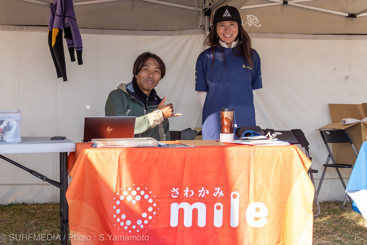ビーチマーシャルでは、田中樹コンテストディレクター(ショートボード)が受付業務にあたる。