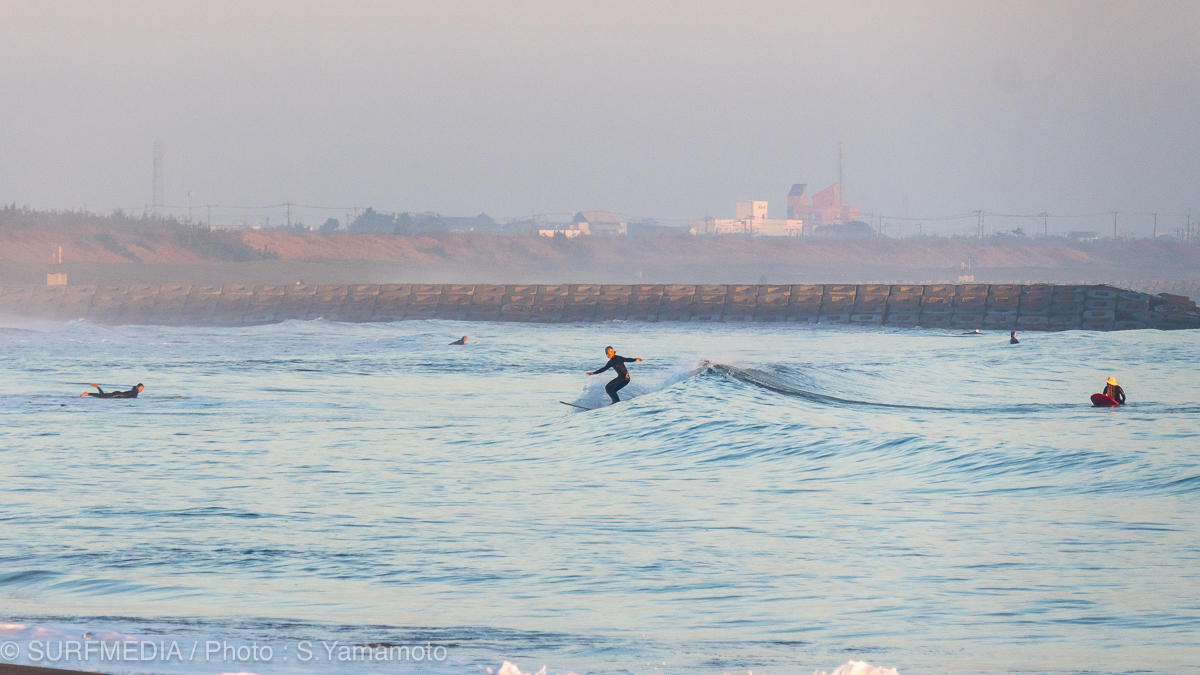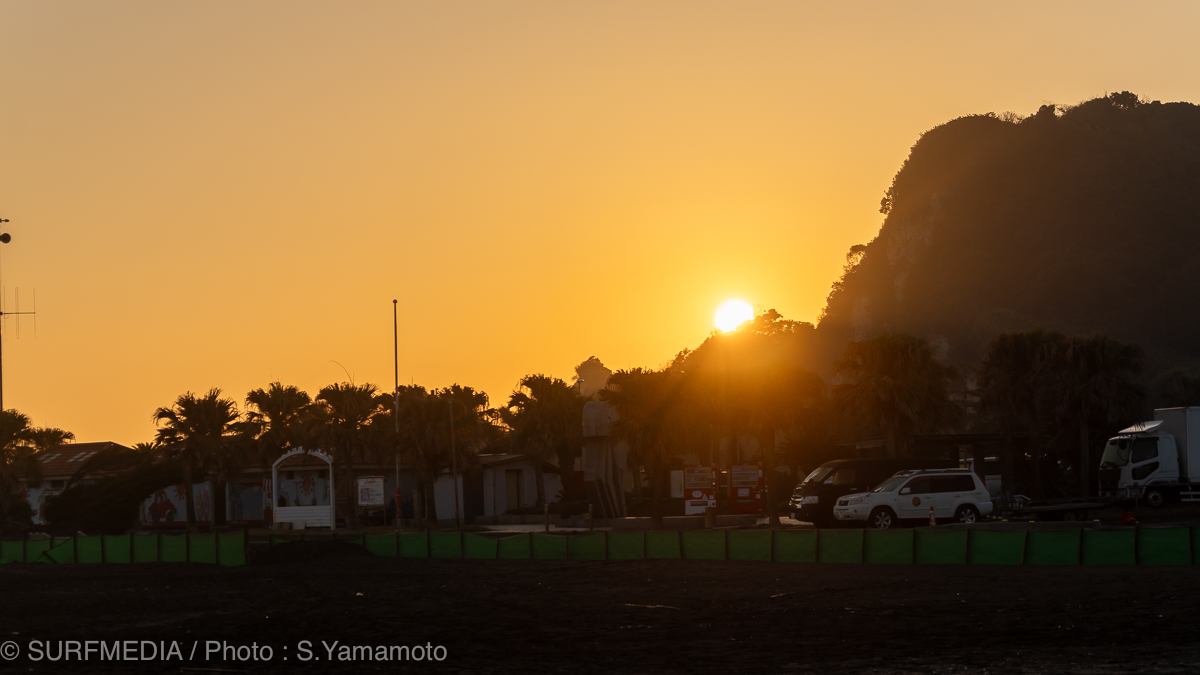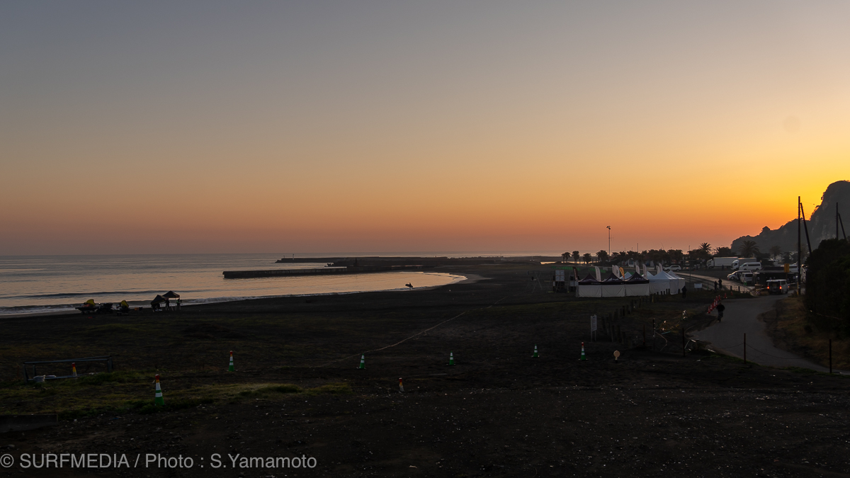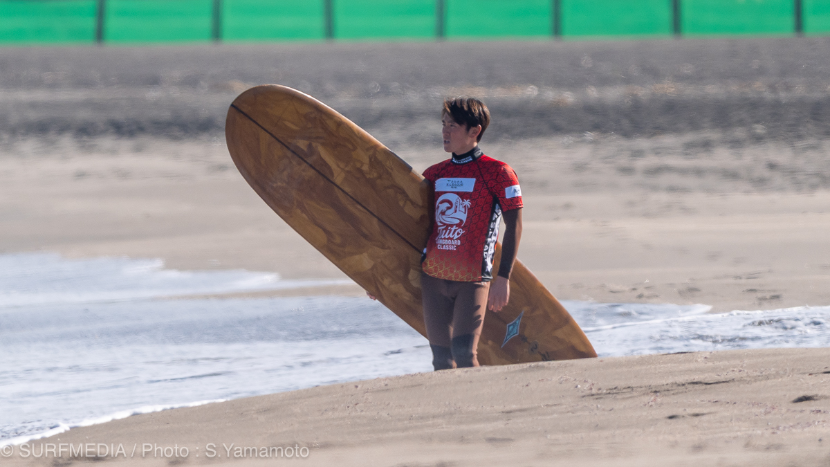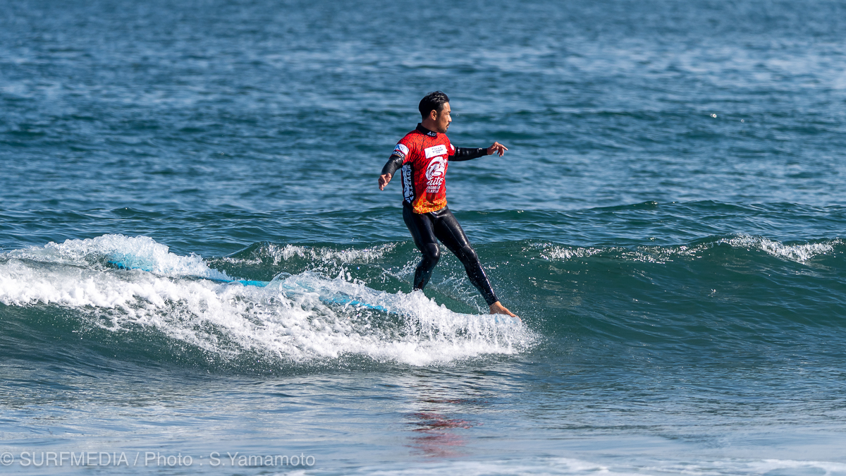 大会初日の会場は晴れ。風はオフからサイドオフへ。波はヒザ〜モモのスモールコンディション。引きに向かう時間帯はワイドなブレイクながら、選べば演技は可能。ただし潮が上げると割れづらく、午後は一気にタフな状況となった。