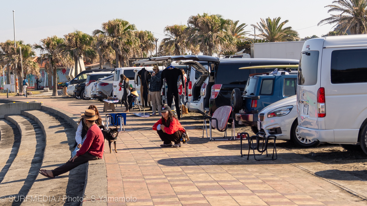 太東の駐車場では、ロングボーダーらしい個性的なボードラックや装備がずらり。