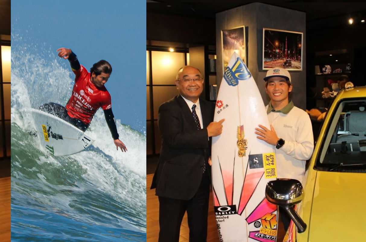今後、大原選手は日本交通のロゴが入ったサーフボードで世界中のコンテストを転戦する。