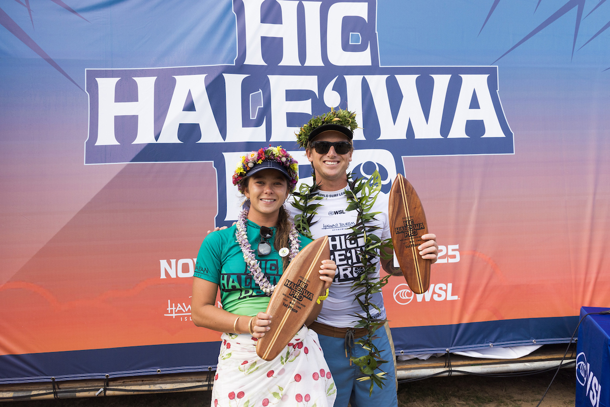 ハレイワ、オアフ島、ハワイ、USA(2025年12月5日金曜日) –ベティルー・サクラ・ジョンソン(HAW)とフィン・マクギル(HAW)が、ワールド・サーフ・リーグ(WSL)クオリファイシリーズ(QS)2000HTA HIC ハレイワ プロで優勝した。