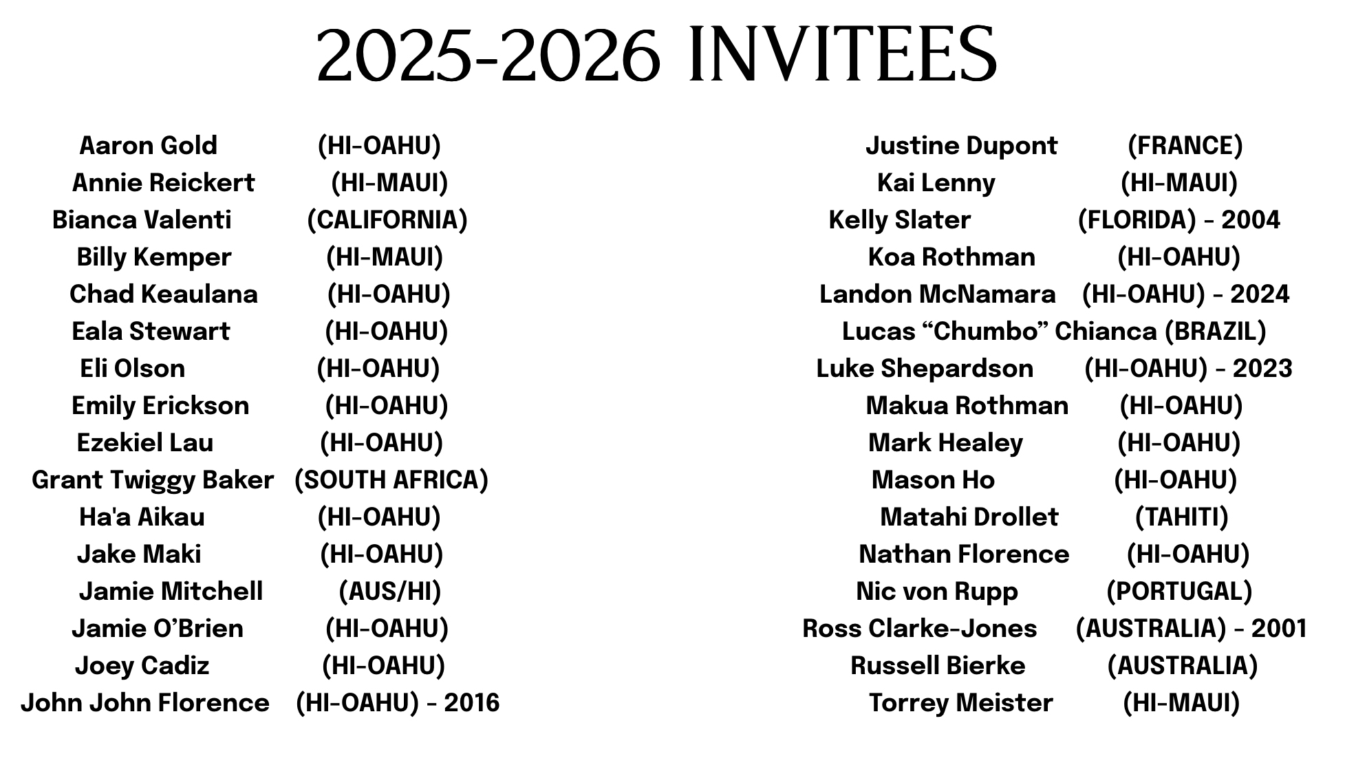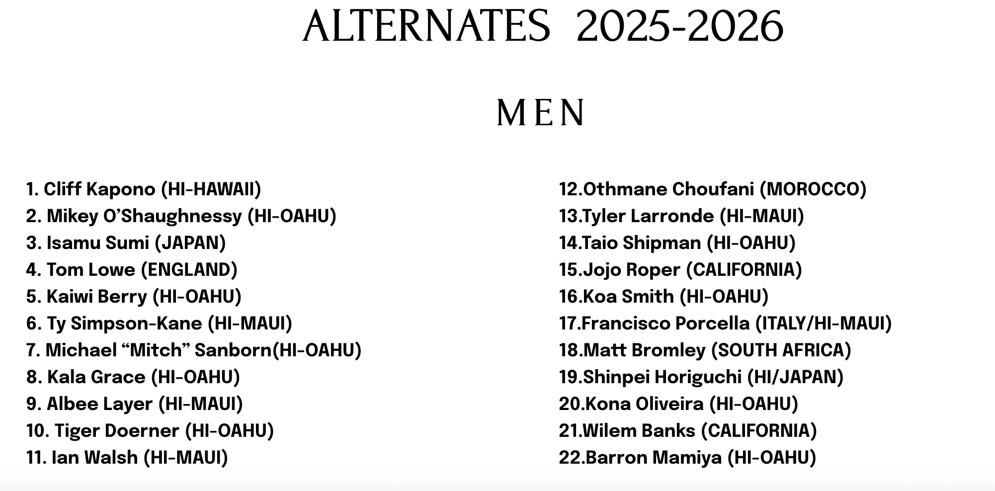 今回のメンバーには、ジョン・ジョン・フローレンス、ケリー・スレーターといったレジェンドたちに加えて、日本人サーファー2名がオートネー(補欠)として選出されている。