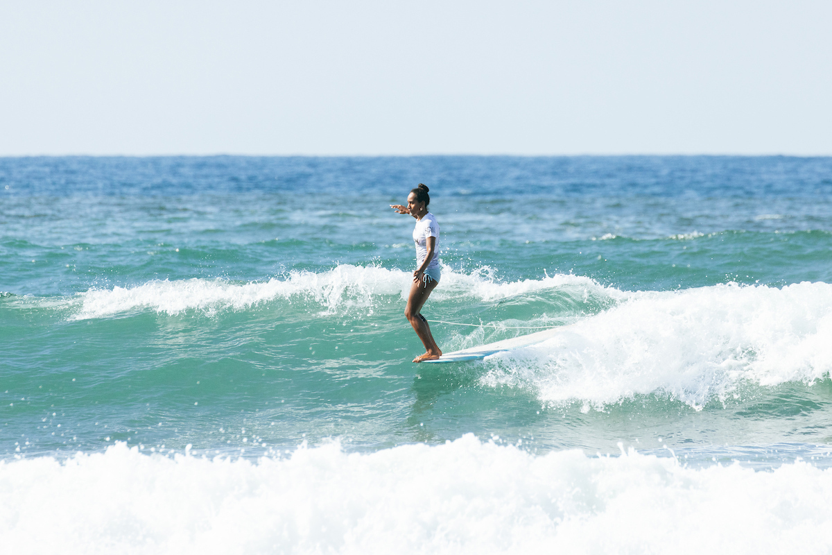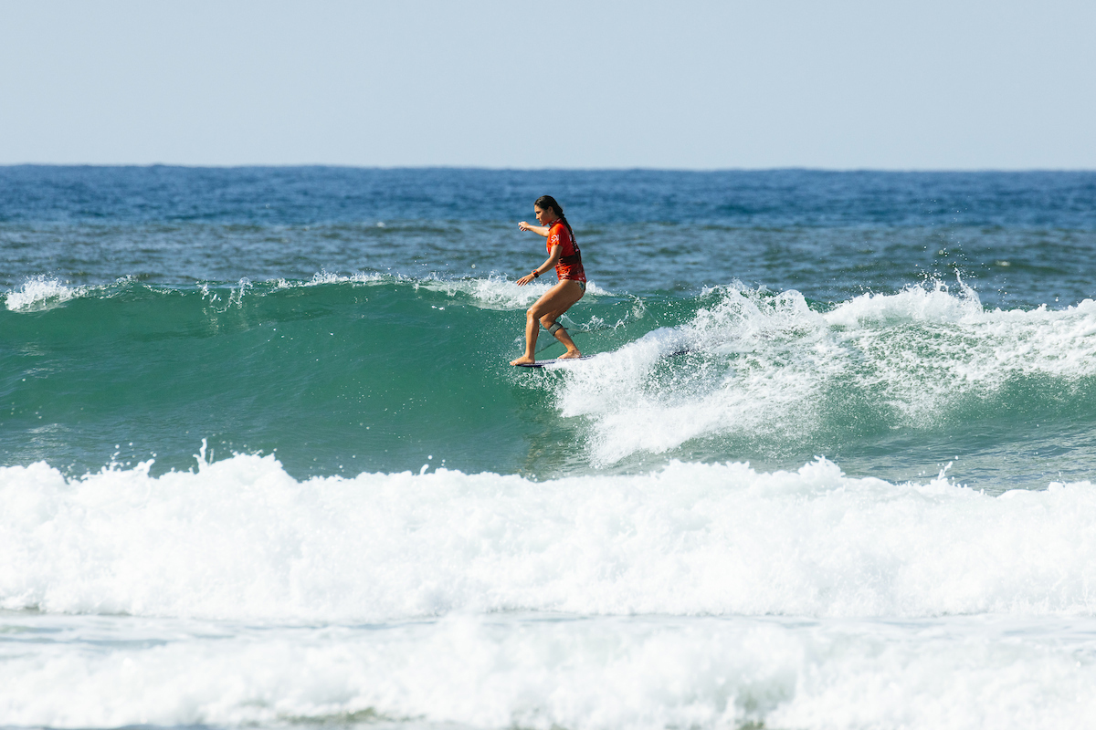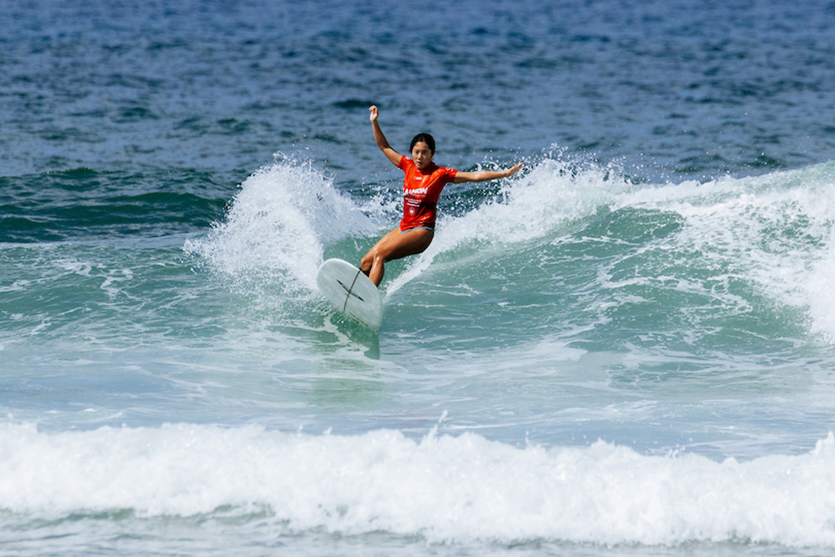 ロングボードツアーで10年以上の経験を持つもう一人の選手、田岡なつみ(JPN)は、初戦のヒートで見事なパフォーマンスを見せた。田岡は複数のクリティカル5を含む高速波で2つのハングテンを決め、この日の最高シングルウェイブ・スコアとなる8.33を記録した。