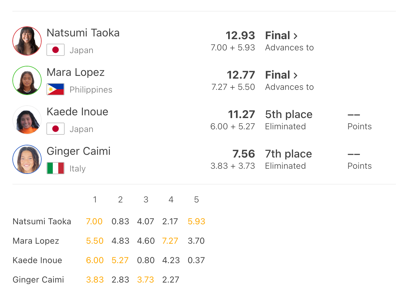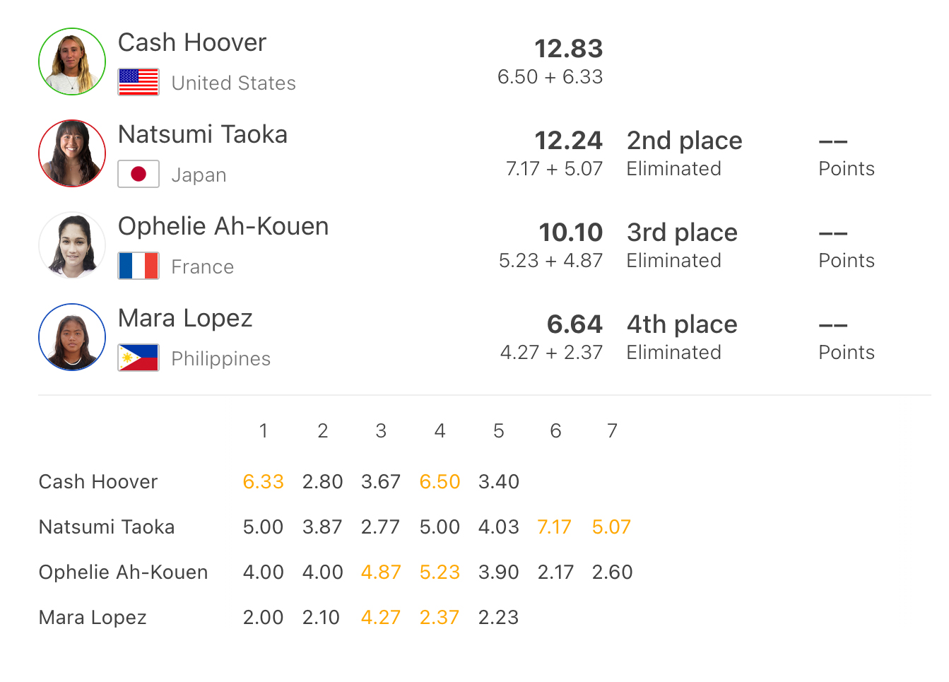 残り時間は5分を切って田岡はインサイドボウルで波を捉え、ビッグフローターを決めるなどのコンビネーションで5.93をスコアして大逆転、トップに躍り出る。楓はニード6.76となり惜しくも3位で敗退。田岡なつみがファイナル進出を決めた。