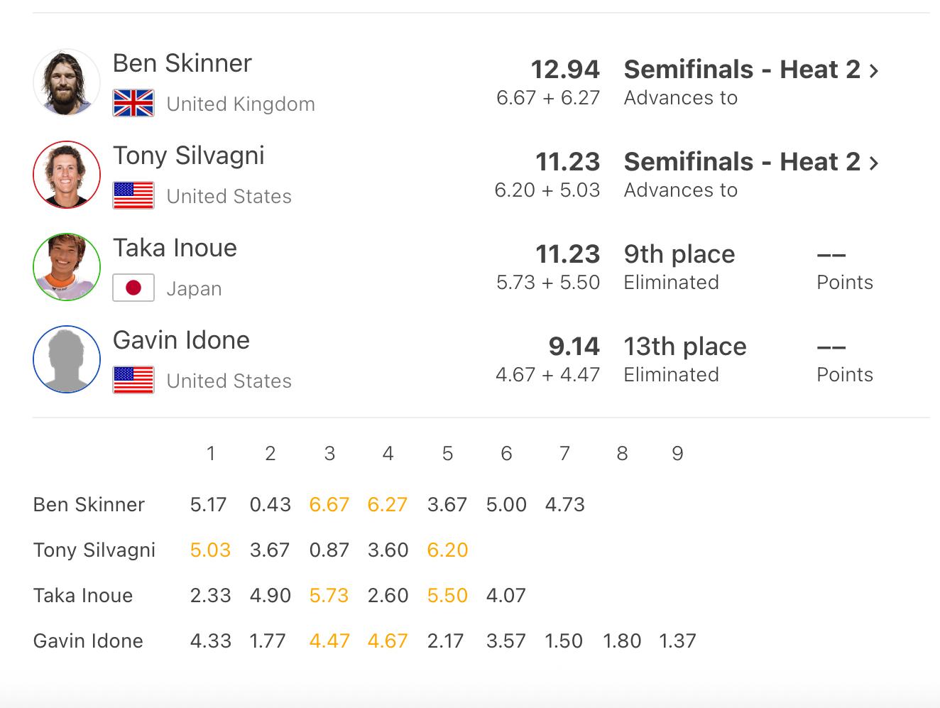 日本男子の井上鷹はQFヒート4でベン・スキナー、トニー・シルバニといったベテラン選手とギャビン・イドーネと対戦。井上鷹は4.90を2.33でバックアップしてヒート前半をリード。