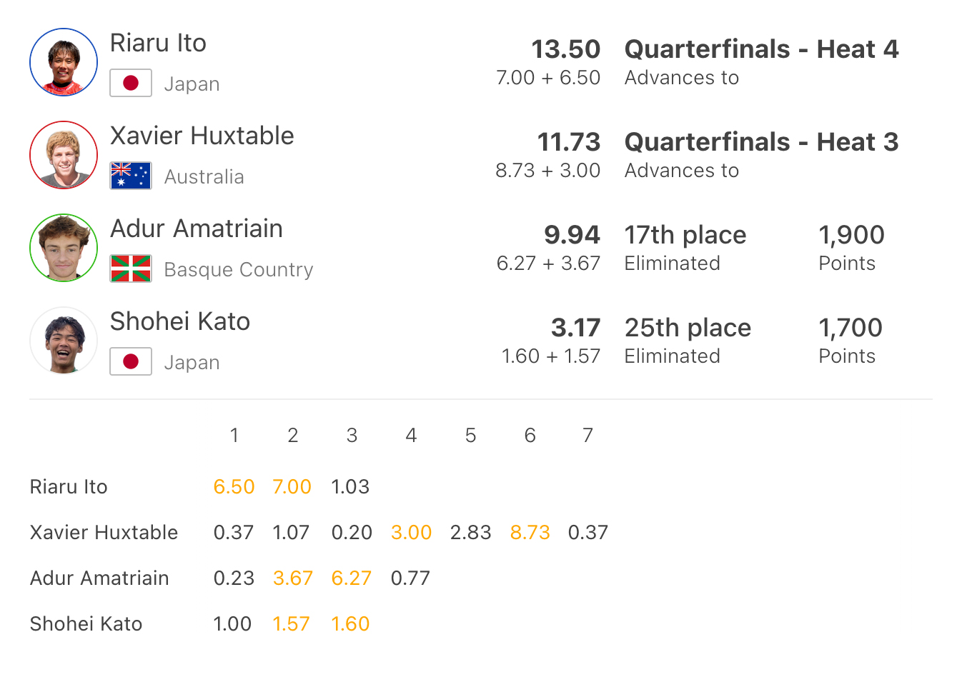 ロブソンは再びバックドアでバレルをメイク、5.50をスコアして逆転トップに躍り出る。2位のリアムとの差は3.37だったが、その後ビッグセットは入らず。