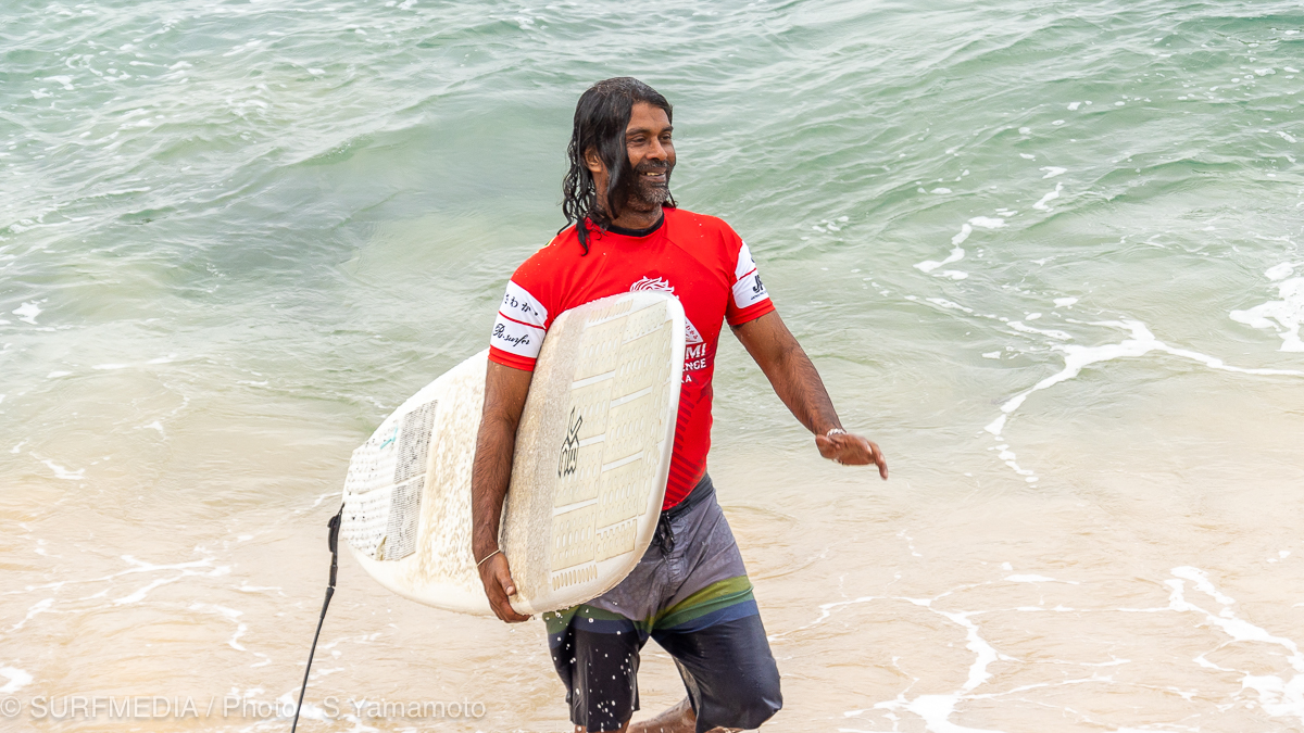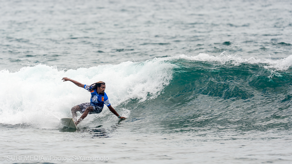 今大会のファーストライドを飾ったのは、地元スリランカのローカルサーファーであり、Sri Lanka Surfing Federation代表を務めるマンボーさん(Sandika Thushra)である。