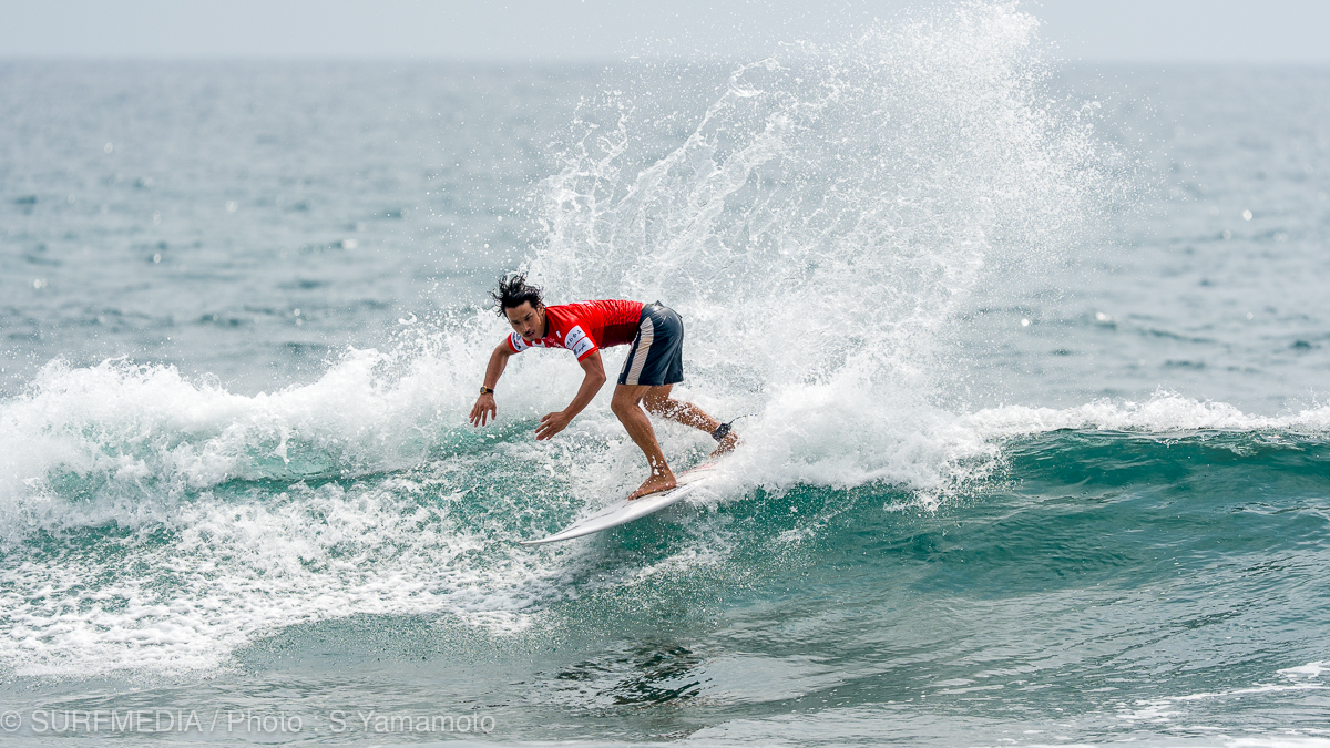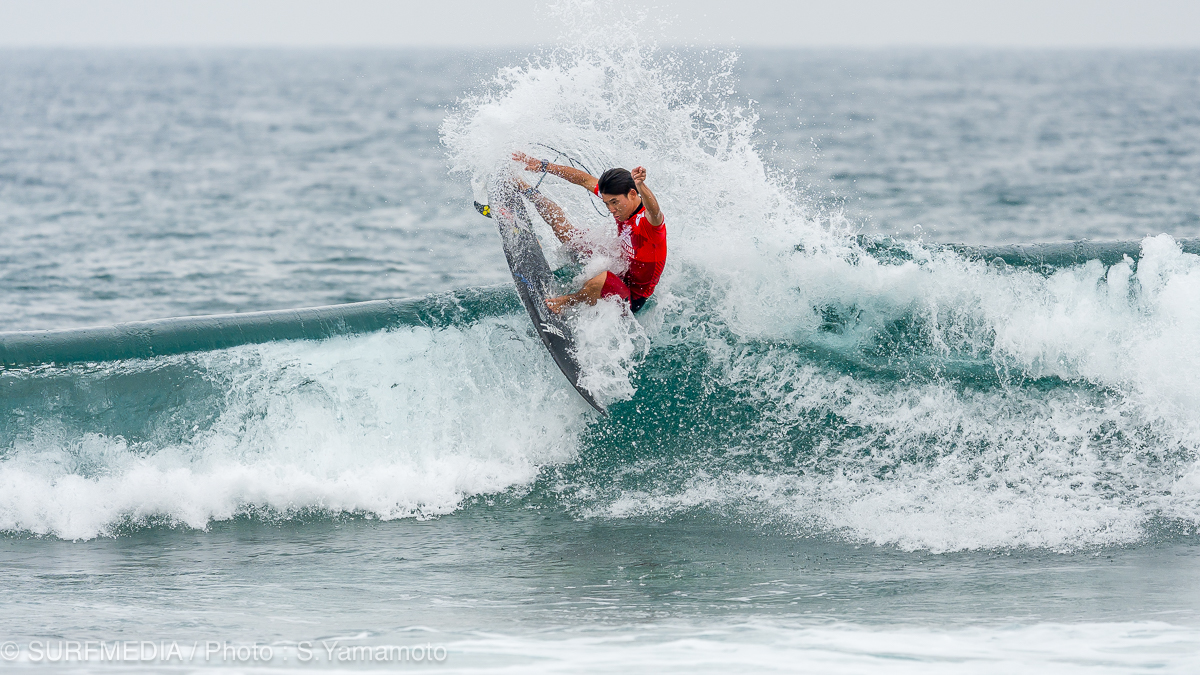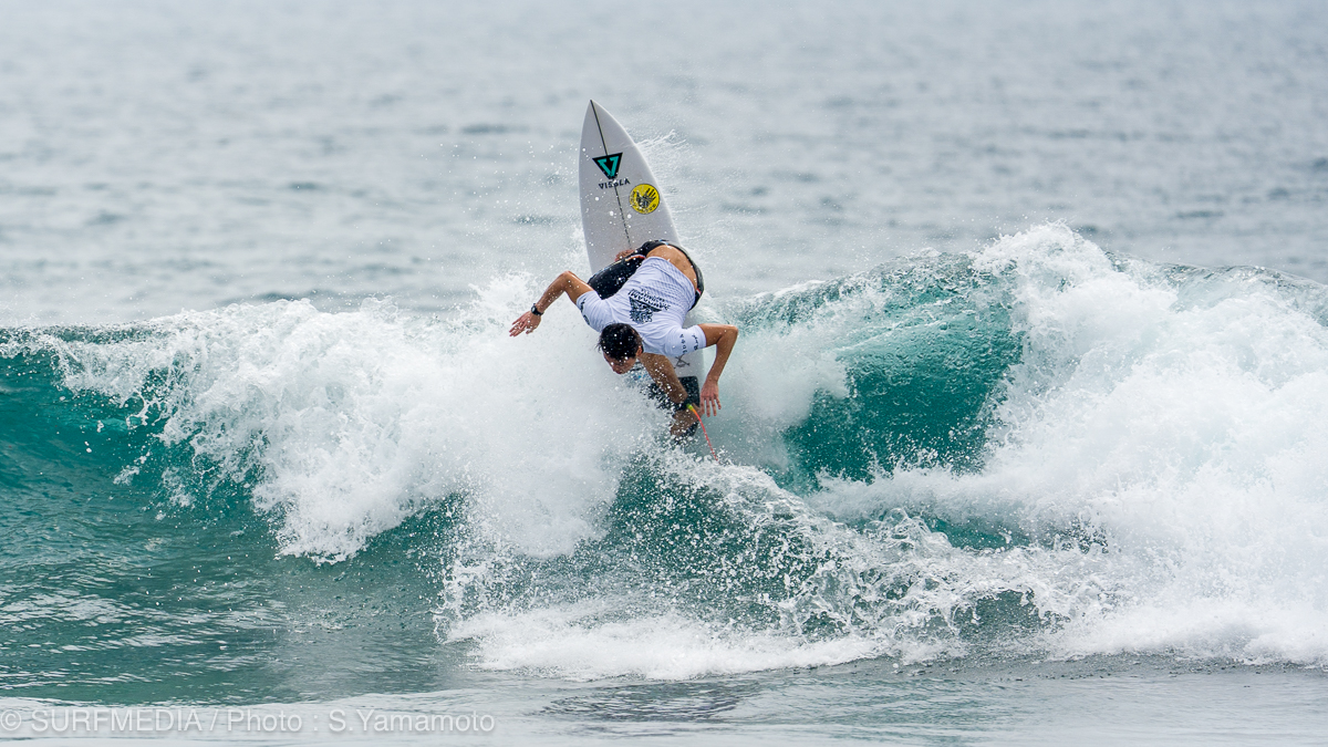 これが的中し、数少ないセットの中から選んだレフトの波で、バックサイドから大きな3ターンコンボで、完成度の高いライディングを披露。8.50ポイントのエクセレントスコアをマークし、これが決め手となって優勝を手にした。