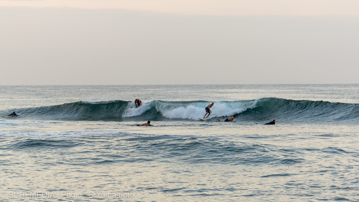 会場のポイントは「Aフレーム」と呼ばれ、ライト、レフトともにブレイク。サイズは1〜2フィートとスモールながら、波の形は整っており、レフトは比較的長いライディングが可能。ライトは距離こそ短いものの、フェイスが張りやすく、リップアクションやエアリアルを仕掛けやすい波。