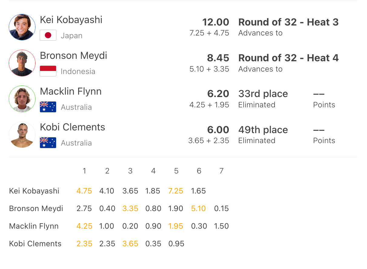 CTサーファーのジョエル・ヴォーン(AUS)はラウンドオブ32に進出に成功したが、同じCTサーファーの和井田リオ(INA)は、タジ・ストークス(AUS)とオーシャン・ランカスター(AUS)との激戦HEATで敗退した。
